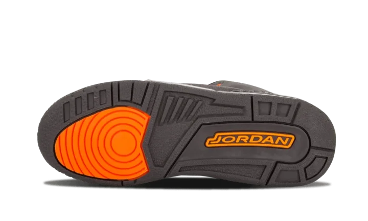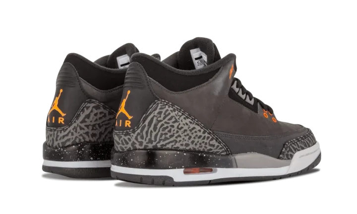 From the "Fear Pack" of 2013, this Air Jordan 3 features a dark grey and black leather upper with orange accents. This listing is for Grade School sizing only.