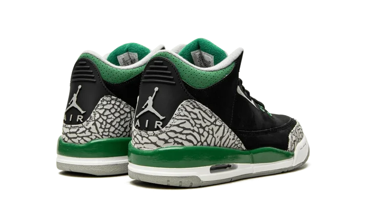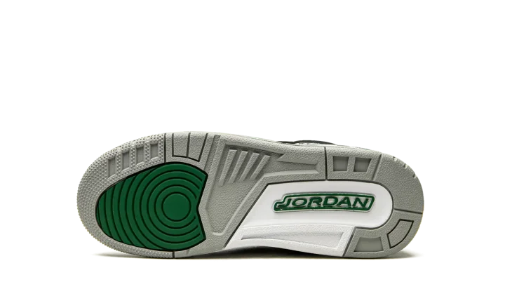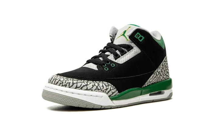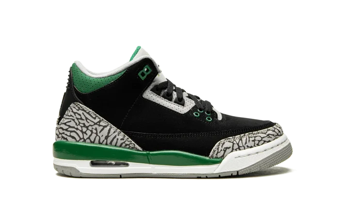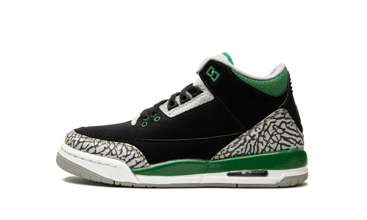 The Air Jordan 3 GS "Pine Green" is the kids sizing of Michael Jordan's third signature shoe in a colorway that shows appreciation to the look of an Oregon Ducks Player Exclusive model. In no way affiliated with the Nike sponsored university, the "Pine Green" is nonetheless a worthy tribute to the many classic Oregon Duck Player Exclusive colorways as the shoe is arranged in the same black, grey, and green color block of several hard-to-come-by Oregon PEs. The upper features a black tumbled leather construction with grey elephant print on the toe and heel. Pine Green accenting comes into play on the painted mudguard on the sides and on the dotted leather collar, top eyelets, and Jumpman on the grey leather tongue. A white Jumpman with an "Air" logo is found on the heel. A small visible Air bubble appears in the heel of the white midsole. Release date: November 11, 2021