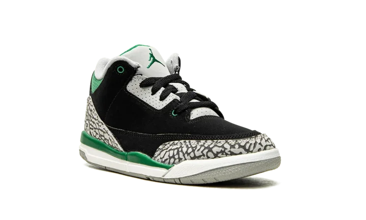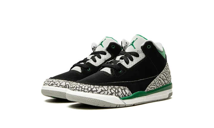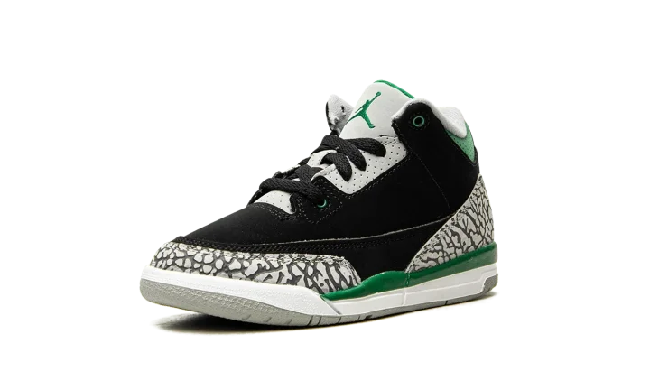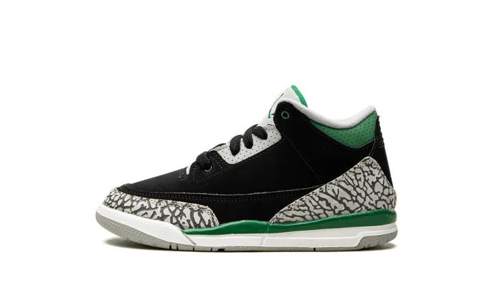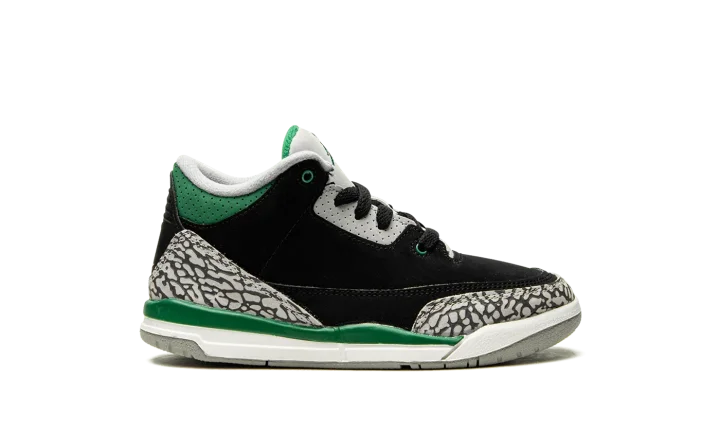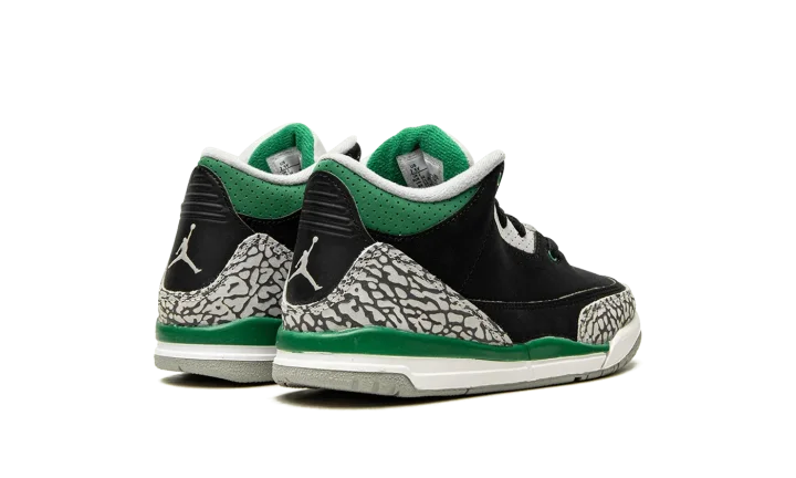 The Air Jordan 3 PS "Pine Green" is the preschool version of the Oregon Ducks-inspired colorway of Michael Jordan's first signature shoe. A Fall 2021 release, the "Pine Green" is inspired by various unreleased Player Exclusive Air Jordan and Nike shoes given to student athletes and facility members of the Oregon Ducks. Black synthetic nubuck covers the base of the shoe. Perforated Pine Green leather appears on the collar and dotted grey leather is located on the eyelets. Contrasting elephant prints on the toe and heel bring a decidedly retro look to the Jordan 3. A Pine Green Jumpman is embroidered on the grey leather tongue and a grey Jumpman appears on the heel. Finishing touches include a green painted mudguard, white foam midsole, and grey outsole. Release date: October 30, 2021