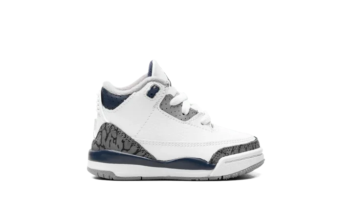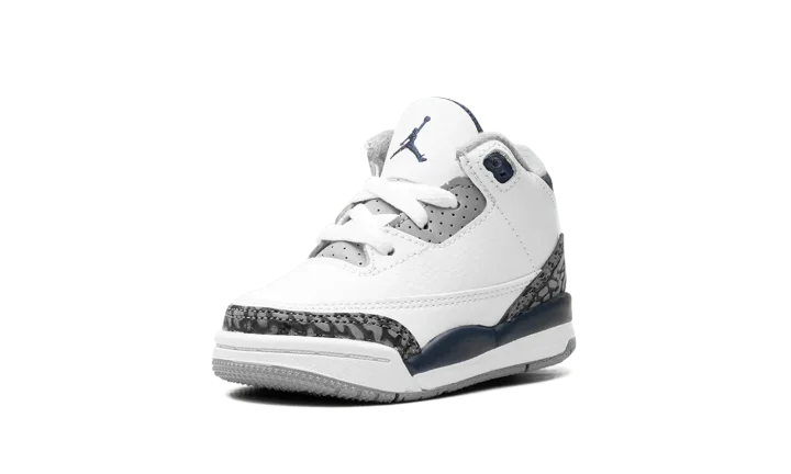 The Air Jordan 3 TD "Midnight Navy" is the toddler sizing of the retro basketball shoe with a timeless design that includes navy accents. Michael Jordan's third signature shoe in the "Midnight Navy" colorway features a white leather construction with elephant print overlays on the toe and heel. A Midnight Navy-colored mudguard contrasts the look, as do the Midnight Navy eyelet holes. More Midnight Navy accenting is featured on the Jumpman on the white leather tongue and on the Jumpman on the heel. The white midsole has a visible Air bubble in the heel. A grey rubber outsole completes the look. Release date: January 13, 2024