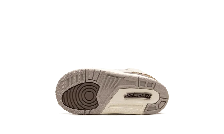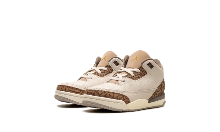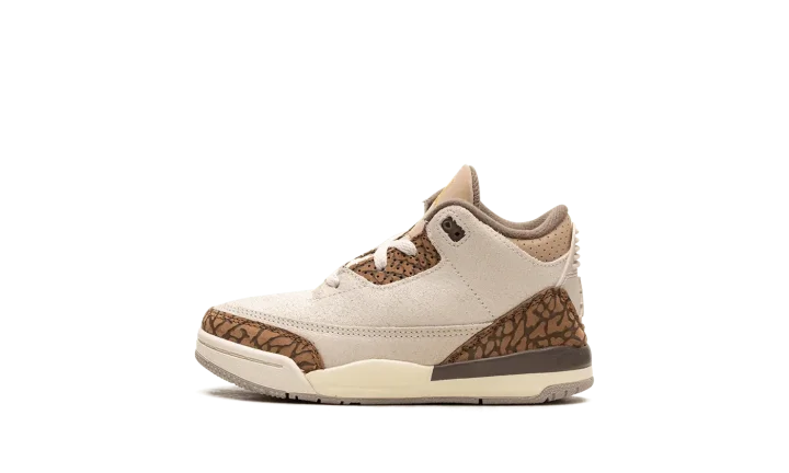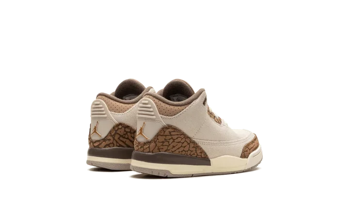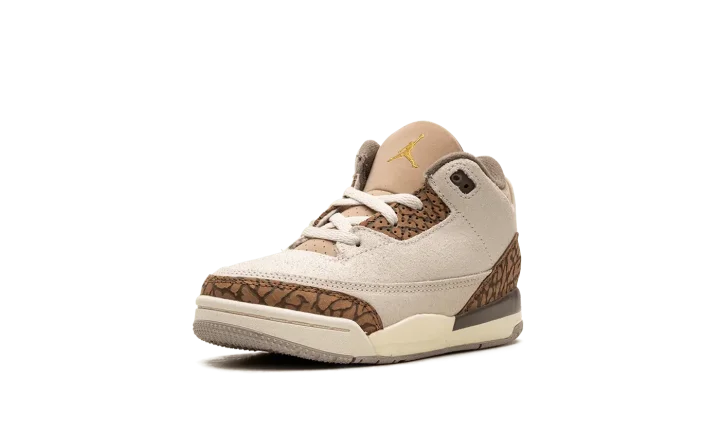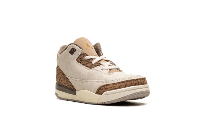 The Air Jordan 3 TD "Palomino" is the toddler sizing of Michael Jordan's third signature shoe in a colorway made of unique materials. The upper has a Palomino-colored suede construction with dark tan elephant print on the toe, eyelet panel, and heel. A Metallic Gold Jumpman appears on the tongue and on the heel. Both the collar and tongue are designed in tan leather and complement the shoe's earth tone appearance. A cream midsole completes the premium colorway. Release date: July 29, 2023