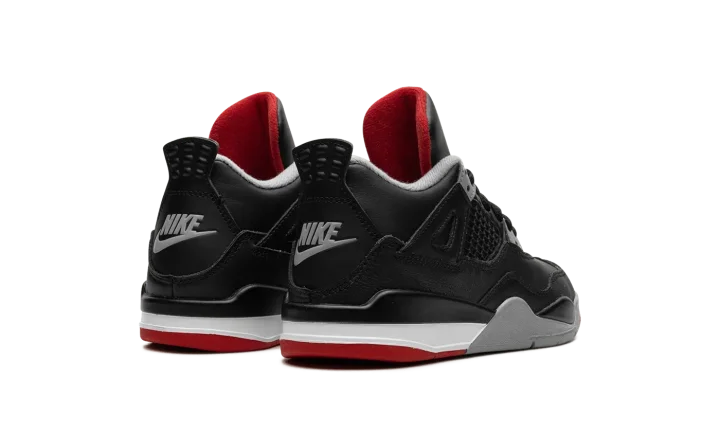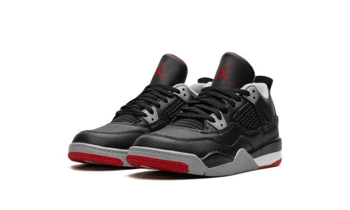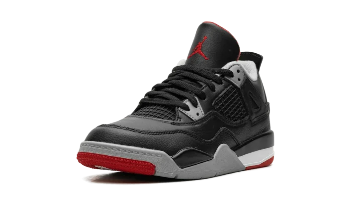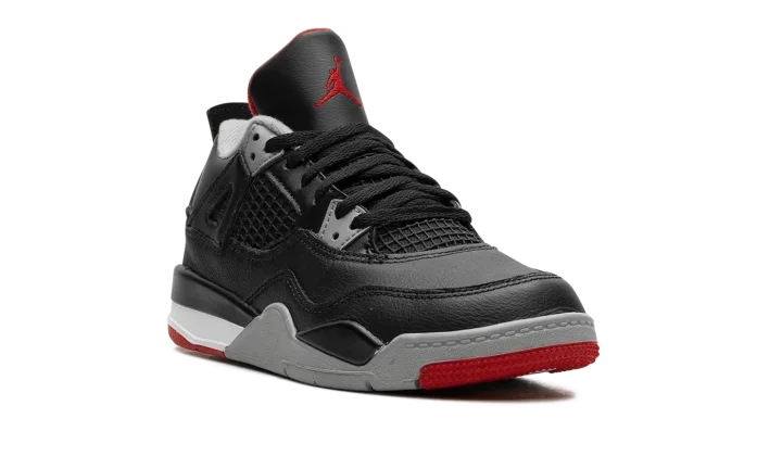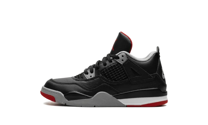 The Air Jordan 4 PS "Bred Reimagined" is the preschool sizing for the colorway of the retro basketball shoe that updates an original design with a new leather construction. The "Bred Reimagined" was released in February 2024 in celebration of the Jordan 4's 35th anniversary. The colorway mimics the original "Bred" Jordan 4 from 1988, but is designed with a black leather upper instead of nubuck, the material that was found on the original version. Black netting is in its usual places for the Jordan 4 on the midfoot and tongue. Cement Grey Nike branding is seen on the heel counter. A red Jumpman is embroidered on the tongue tag. Release date: February 17, 2023