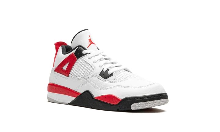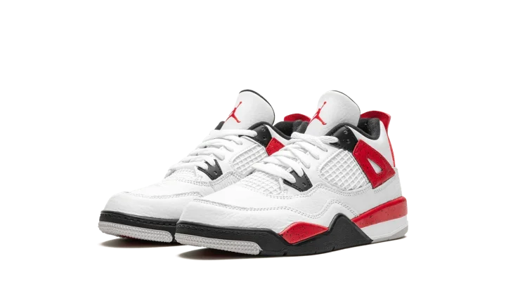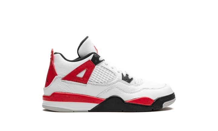 The Air Jordan 4 PS "Red Cement" is the preschool sizing of the retro basketball sneaker in a colorway inspired by the Jordan 4's original "White Cement" style. The "Red Cement' Jordan 4 replicates the design of the model's "White Cement" colorway, but features red detailing whereas the "White Cement" has grey cement patterning. The "Red Cement" features a white leather upper with tonal leather overlays and white netting on the tongue and mid-panel. The black plastic eyelets are contrasted by Fire Red "wings" with speckle patterning. The fiery red speckled motif also appears on the shoe's mudguard and heel counter. A black Jumpman can be found on the tongue and heel. Release date: September 9, 2023