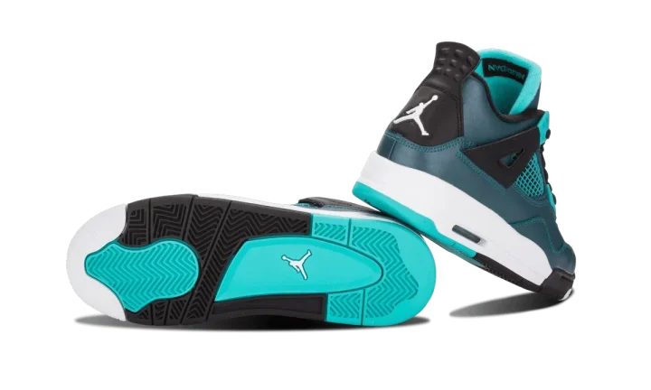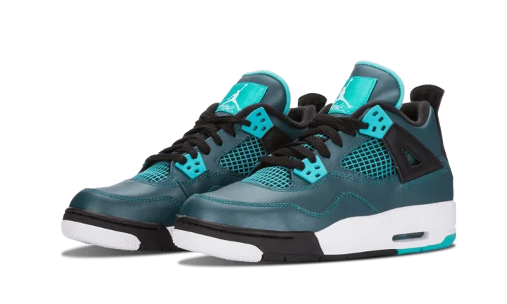 One of the first "Remastered" Air Jordan retro releases, this all-new colorway of the famous Air Jordan 4 from 2015 features a dark teal leather upper with black accents and highlights in bright teal. A release for Jordan Brand's 30th anniversary, the shoes come with special "30" Jumpman logos on each insole. Please note: this listing is for YOUTH sizes only.