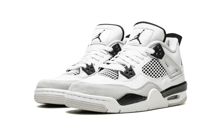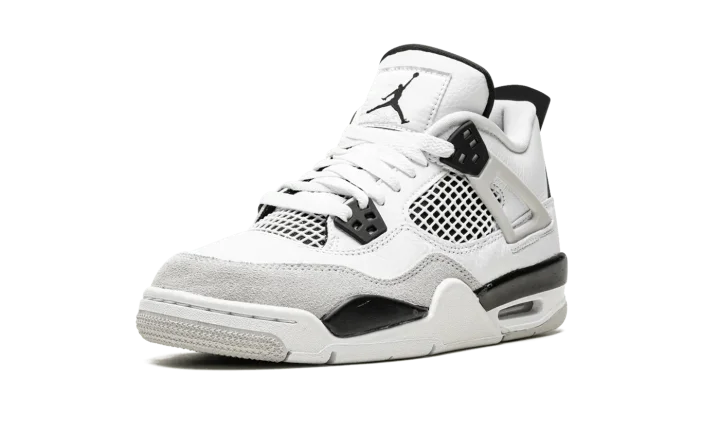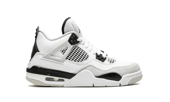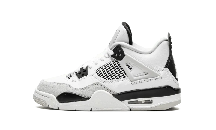 The Air Jordan 1 GS "Military Black" is the youth sizing of the colorway of Michael Jordan's fourth signature shoe that replicates the color block of the model's popular, original "Military Blue" style from 1989. The Jordan 4 GS "Military Black" is inspired by the Jordan 4 "Military Blue" as it features the same color design as the old school colorway, just with black accents instead of blue. The shoe's upper is constructed with a white leather base with grey suede on the forefoot overlay. The TPU eyelets and heel counter are accented in black. As are the underlays beneath the netting on the sides and on the tongue. Classic Jumpman logo detailing can be found on the heel and on the tongue tag. Release date: May 21, 2022