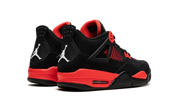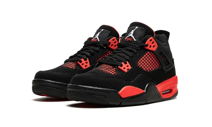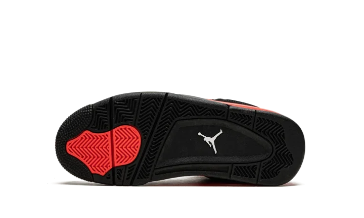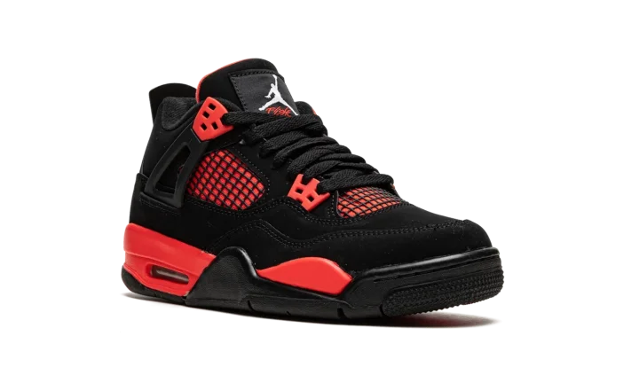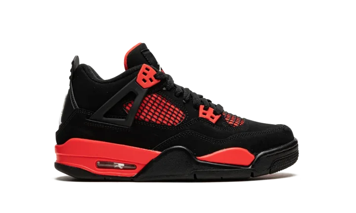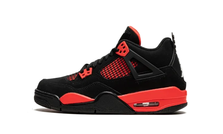 The Air Jordan 4 GS "Red Thunder" is the kids version of the colorway of Michael Jordan's fourth signature model that is inspired by a classic, non-original release of the vintage basketball shoe. The shoe we're referring to is the Air Jordan 4's "Thunder" colorway that debuted along with the popular "Lightning" colorway in 2006 before later returning as a standalone release in 2012. The "Red Thunder," as implied by its name, is styled similarly to the original "Thunder," but trades Tour Yellow accenting for red. The upper features a black synthetic nubuck base with red "wings" and a red mid-panel contrasted with black netting. The look is repeated on the tongue. Additional red detailing comes into play on the underside of the tongue, on the painted midsole, and on the "Flight" branding in script beneath the white Jumpman on the black nylon tongue tag. A white Jumpman appears on the heel. Finishing touches include a small visible Air unit in the heel of the midsole and a black rubber outsole. Release date: January 15, 2022