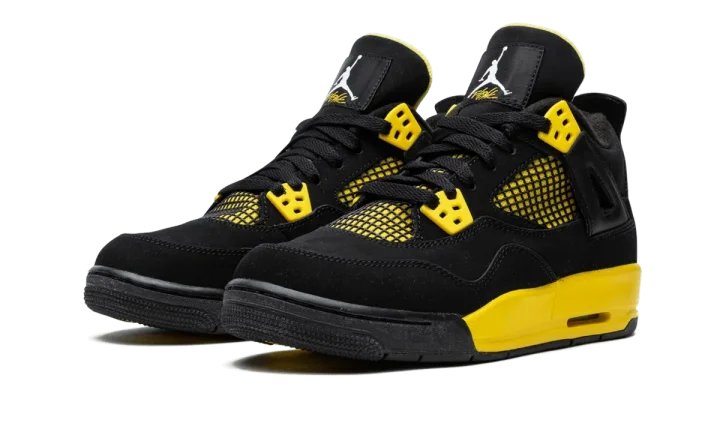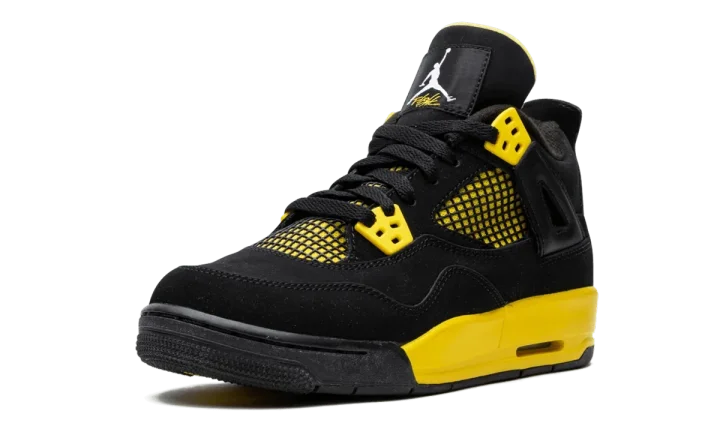 Originally released in 2006, the popular "Thunder" colorway of the Air Jordan 4 was back in 2012 for a refresh. Reversing its accompanying "Lightning" colorway, the shoe features a black upper with Tour Yellow accents. This listing is for Grade School sizing.