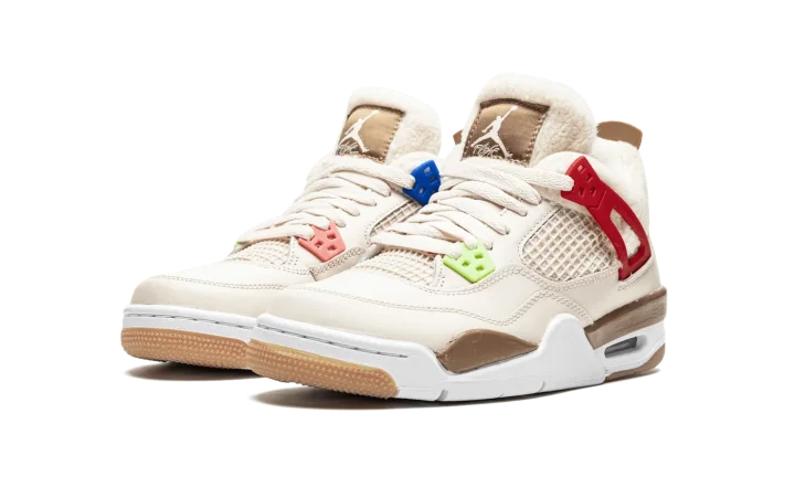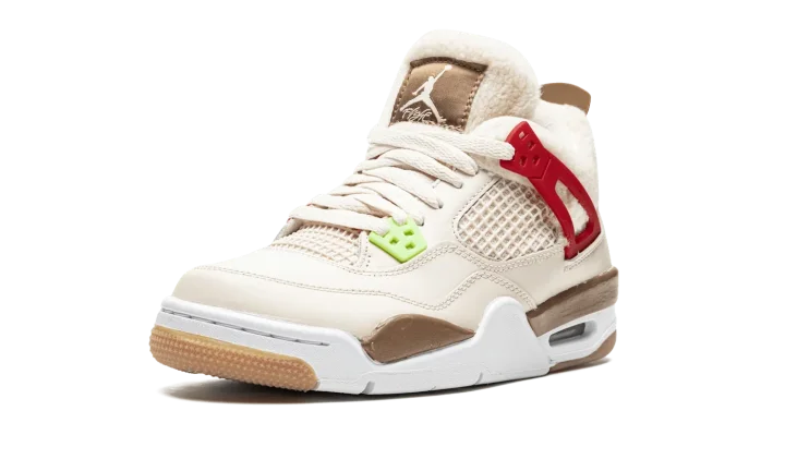 The Air Jordan 4 GS "Where the Wild Things Are" is a youth-exclusive colorway of Michael Jordan's fourth signature shoe based on the 1963 children's novel of the same name. From Jordan Brand's Holiday 2021 collection, this November 2021 release includes design elements inspired by "Where the Wild Things Are" written and illustrated by Maurice Sendak. A fuzzy, sherpa-like material appears on the collar and tongue. Tan leather appears on the base. The lower eyelets appear in neon green and neon pink, and the "wings" lace holders are dipped in a bright red and blue hue. A brown tongue tag with white Jumpman and "Flight" detailing contrasts the appearance of the upper. Jordan adds a classic Jumpman logo to the heel to finish the look. Release date: November 5, 2021