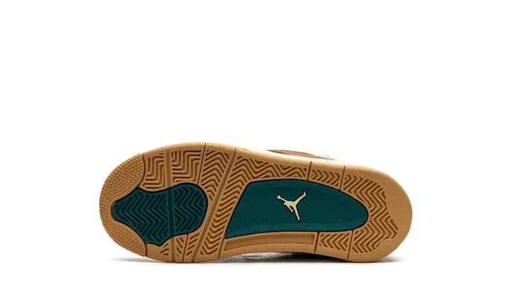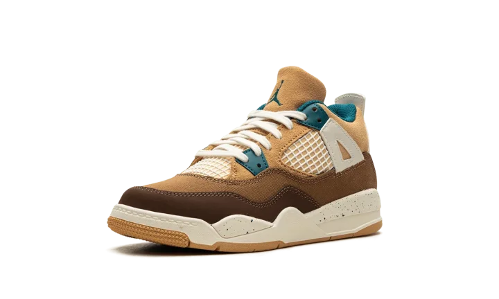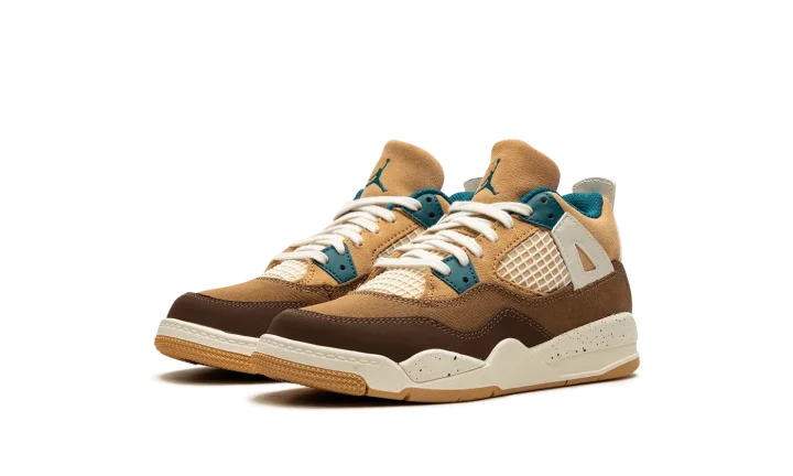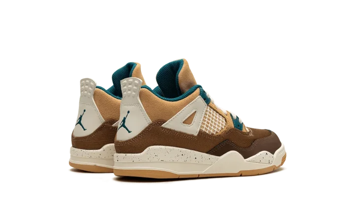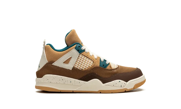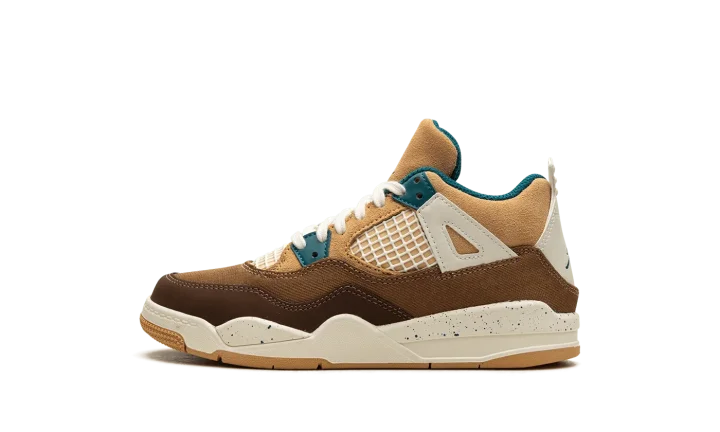 The Air Jordan 4 Retro PS "Seasonal Collector" is the preschool sizing of the colorway inspired by children playing outside and the great outdoors. The "Seasonal Collector" features an array of materials and neutral colors on its design, with shades of brown and tan appearing on the upper. White netting is seen on the tongue and on the mid-panel. Geode Teal accenting can be found on the eyelets, as well as on the speckling seen on the white laces, the Jumpman on the tongue and on the heel, and the inner lining. Underfoot, the shoe's white midsole features blue speckling.