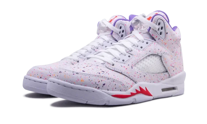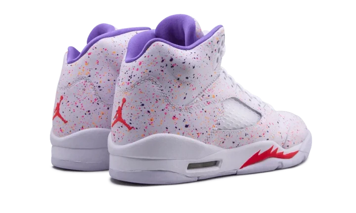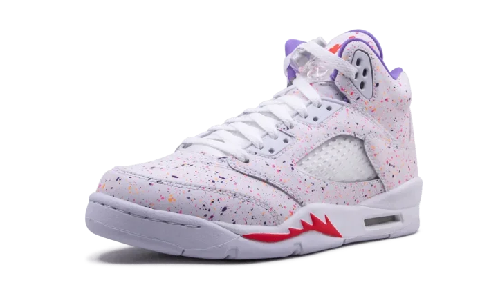 The Air Jordan 5 GS "Easter" comes in youth sizing and features a cheery color scheme for the Easter holiday season. Designed just for kids, the "Easter" design features a white leather upper with a vibrant all-over speckled motif contrasting the stark backdrop. White netting graces the mid-panel while an embroidered red Jumpman on the tongue and heel provides classic Jordan Brand detailing. The sharktooth design on the midsole is finished off with red accenting. Visible Air in the heel provides a comfortable fit.