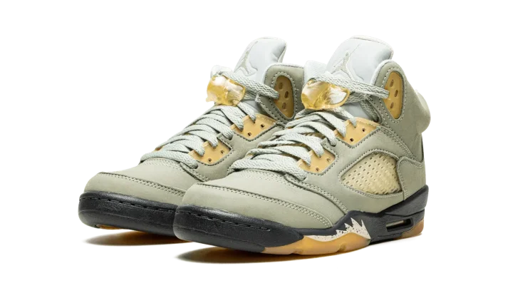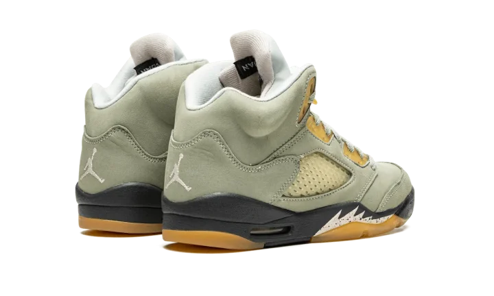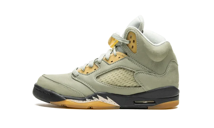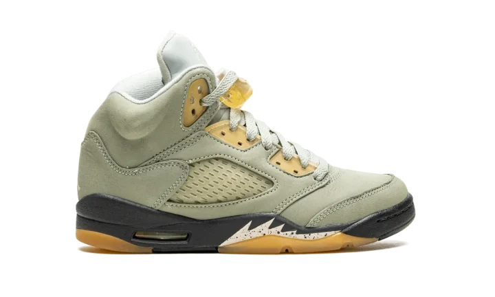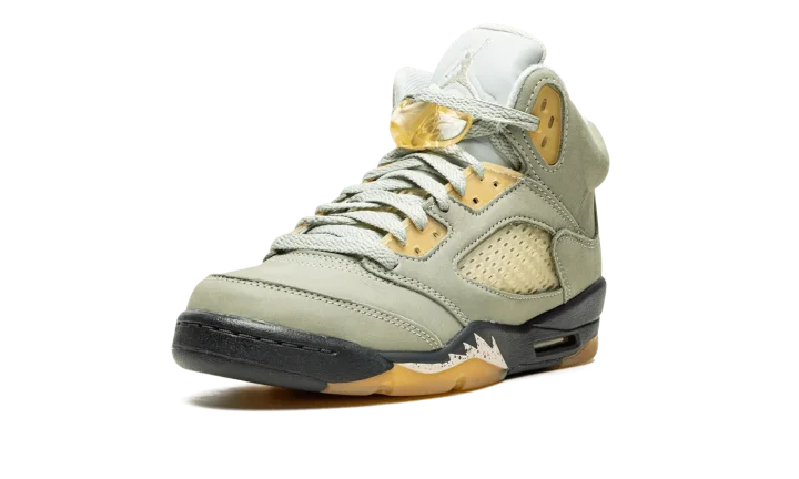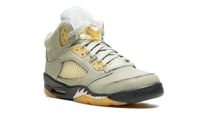 The Air Jordan 5 GS "Jade Horizon" was released in March 2022 and is a colorway of the vintage basketball shoe with retro-inspired details. A versatile look for the popular lifestyle shoe worn by Michael Jordan with the Chicago Bulls in 1991, the Jordan 5 in "Jade Horizon" has a Jade Horizon-colored leather construction. The eyelet panels, lace toggle, and outsole feature a vintage-inspired, oxidized appearance. A white Jumpman is embroidered on the silver reflective tongue that shines when exposed to light in the dark. Additionally, a white Jumpman is embroidered on the heel. Finishing touches include a black painted midsole with white "shark tooth" detailing with black speckling on the forefoot. Release date: March 25, 2022