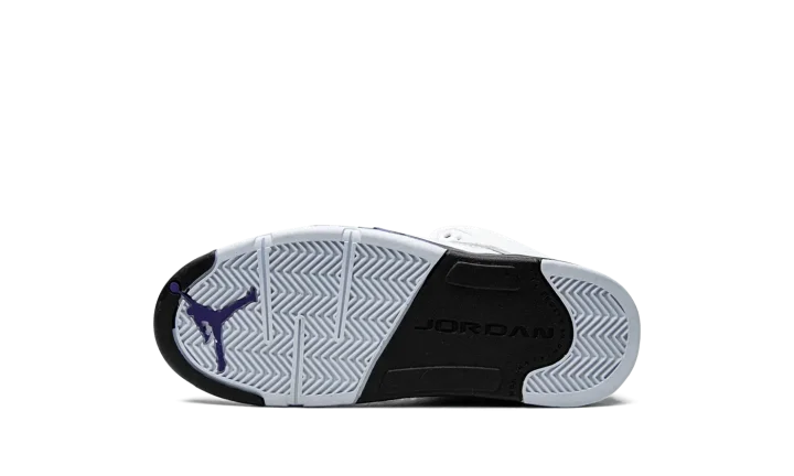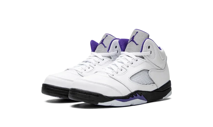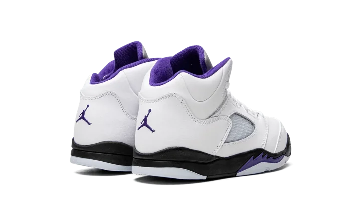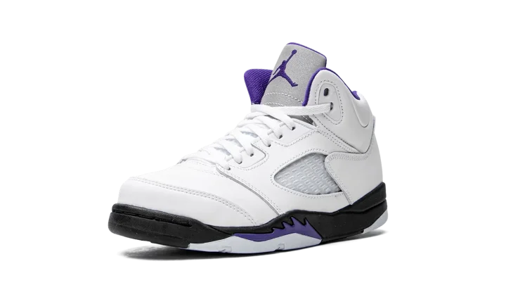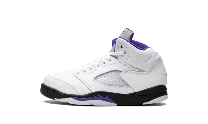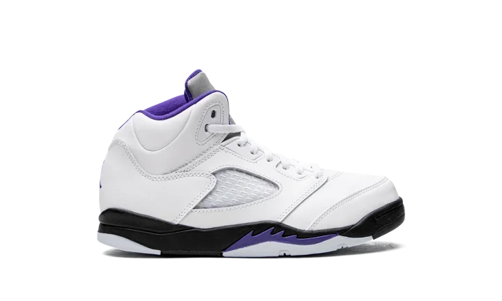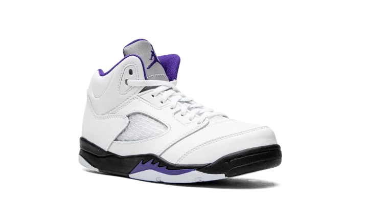 The Air Jordan 5 PS "Concord" is the preschool sizing of the retro basketball shoe in a colorway inspired by the beloved Air Jordan 11. The "Concord" theme was introduced on the Jordan 11 in 1996, and is one of the most popular colorways in sneaker history. On this Jordan 5, the "Concord" features the same color block as the model's classic "Fire Red" colorway, albeit with purple accents instead of red detailing per the original version. The upper is constructed from white leather. Translucent mesh is found on the mid-panel and lower tongue. A Concord (purple) Jumpman is embroidered on the heel. Additional Concord accenting can be found on the Jumpman on the reflective Metallic Silver tongue, on the collar, on the underside of the tongue, and on the shark tooth detailing on the black midsole. Release date: August 13, 2022