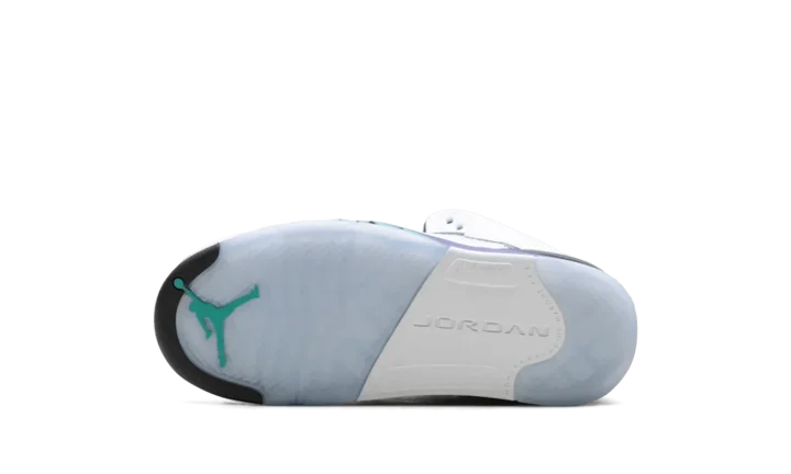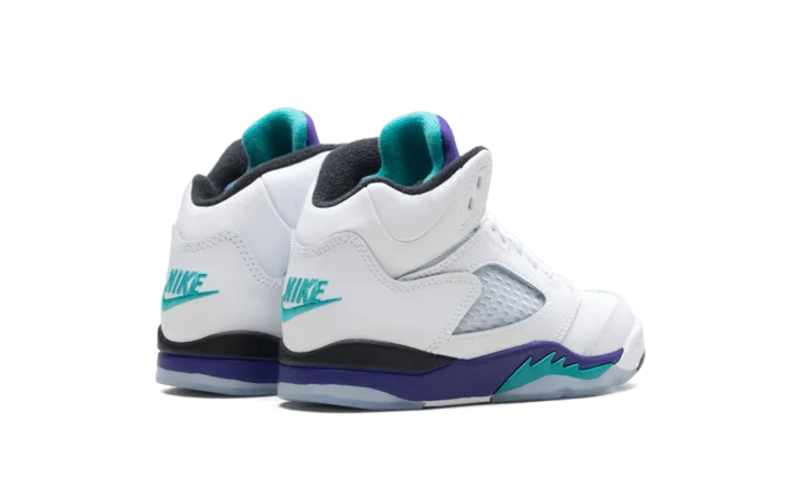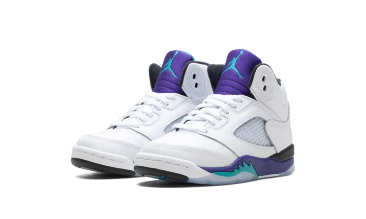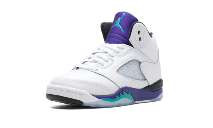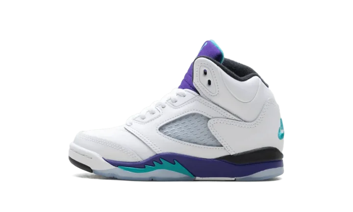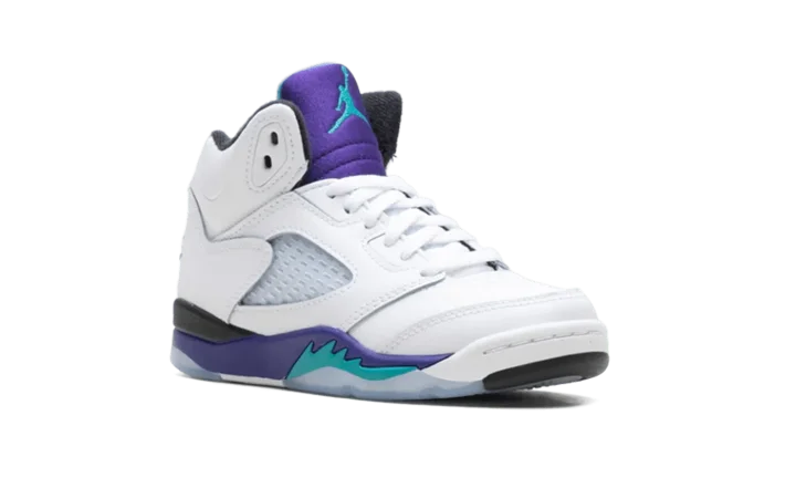 Introduce your future sneakerhead to a cultural icon with the Air Jordan 5 Retro PS "Grape." This pre-school model keeps the legendary 1990 style with its crisp white leather upper and iconic Grape Ice and New Emerald color pops. The design features the signature lace lock, breathable netting, and fighter jet-inspired "shark teeth" detailing. Scaled down for little feet, it provides durable leather and soft foam cushioning, ensuring your little one is comfortable while rocking a true piece of hoops history.