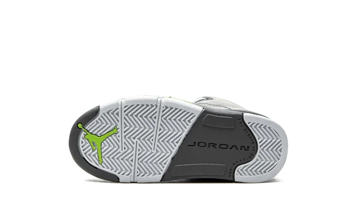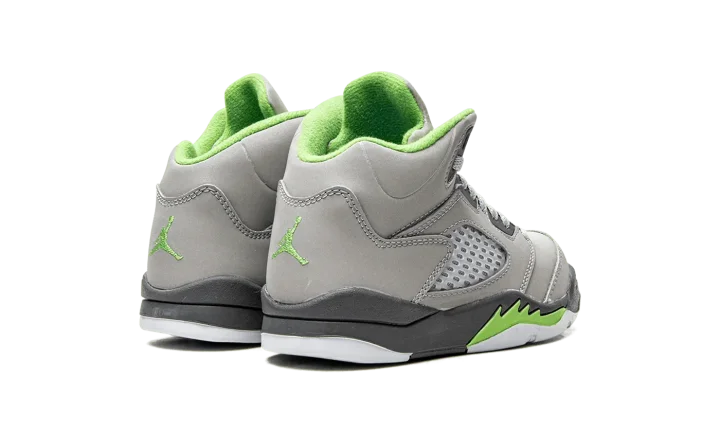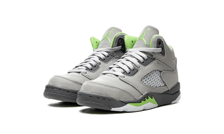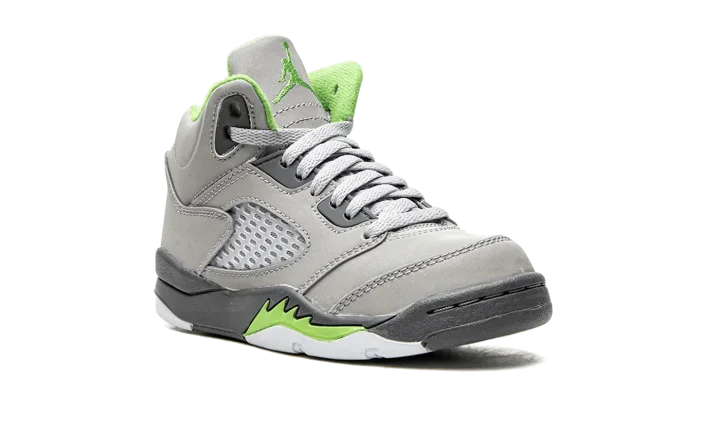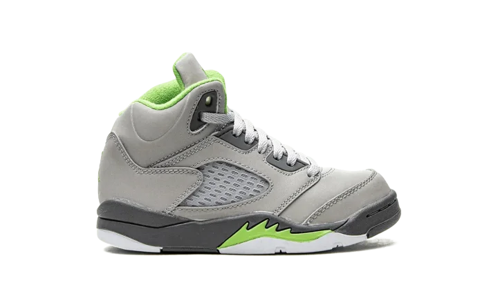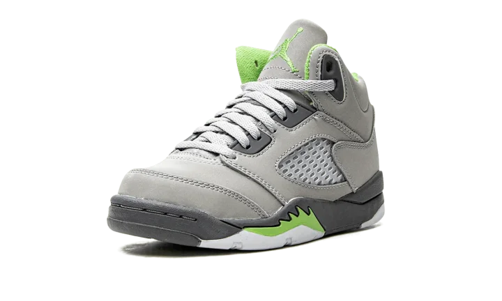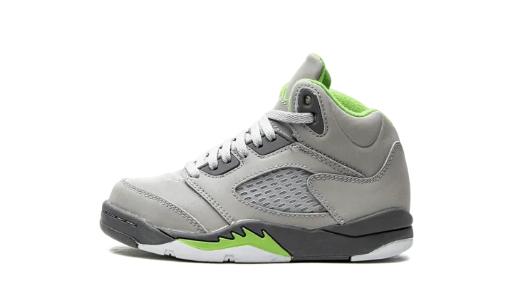 The Air Jordan 5 PS "Green Bean" is the pre-school children's sizing of the classic Jordan 5 colorway that originally released in 2006 and returned in 2022. The "Green Bean" Jordan 5 for kids features a fully reflective matte silver upper with bright green accents throughout, including for the signature shark tooth detailing at the midsole.