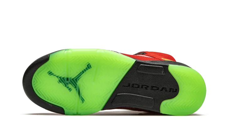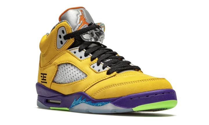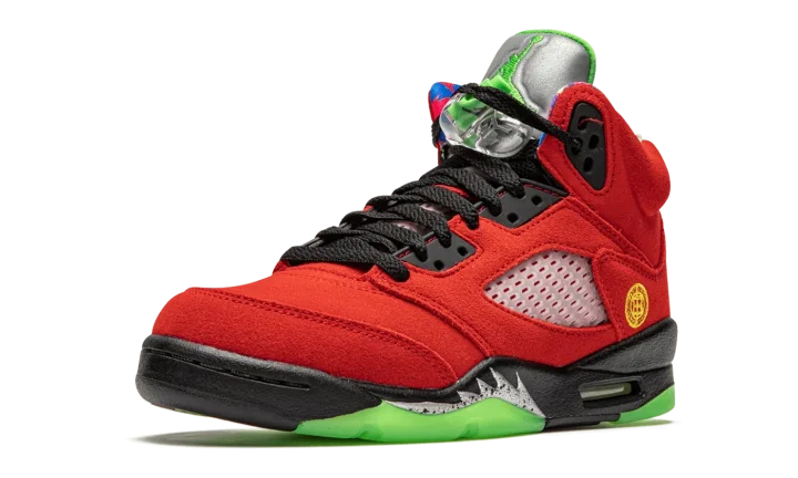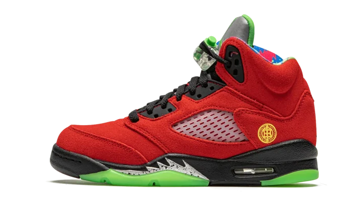 The Air Jordan 5 GS "What the" is the youth sizing of the mash-up colorway that honors the 30-year anniversary of Michael Jordan's fifth signature shoe. Some of the model's most popular, non-original looks like the "Quai 54," "Raging Bull," and "Bel-Air" are referenced in the design of the "What the" Jordan 5. Breaking it down by shoe, the left shoe features the "Raging Bull's" supple all-red suede upper with "Quai 54" accenting on the shark tooth midsole and tongue. The right shoe displays an all-yellow nubuck build referencing the sought-after "Tokyo T23" colorway, with the "Army Green's" silver and orange tongue and the "Bel-Air's" shark tooth motif on the midsole. Consistent on pairs are the nods to the "Tokyo T23" and "Shanghai" colorways with emblems from the two design embroidered on opposite heels. Release date: November 7, 2020.