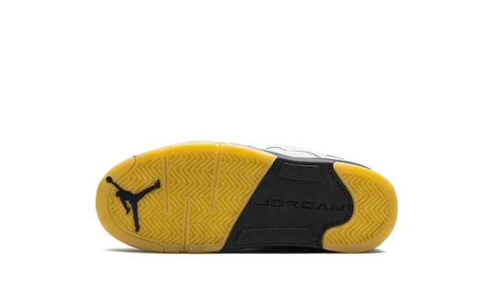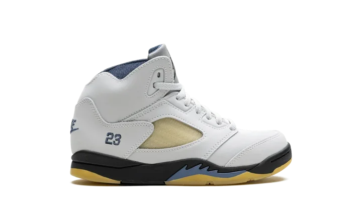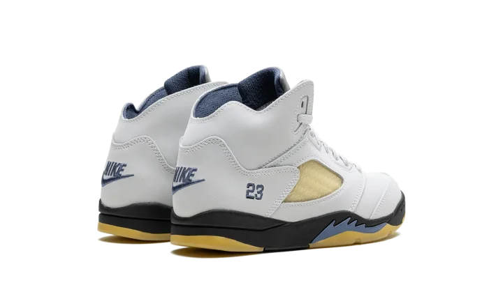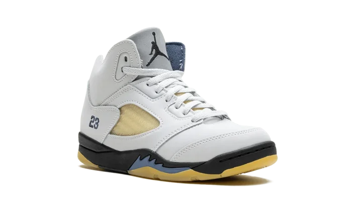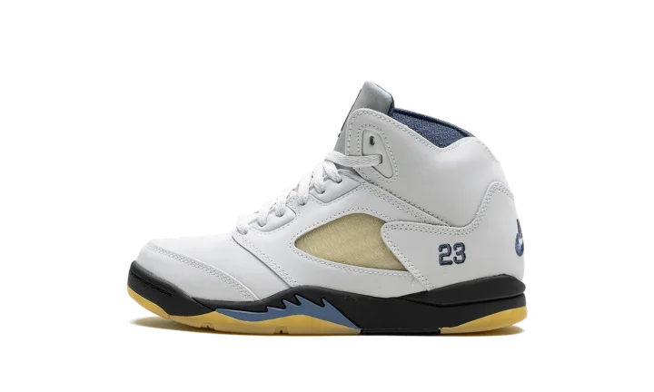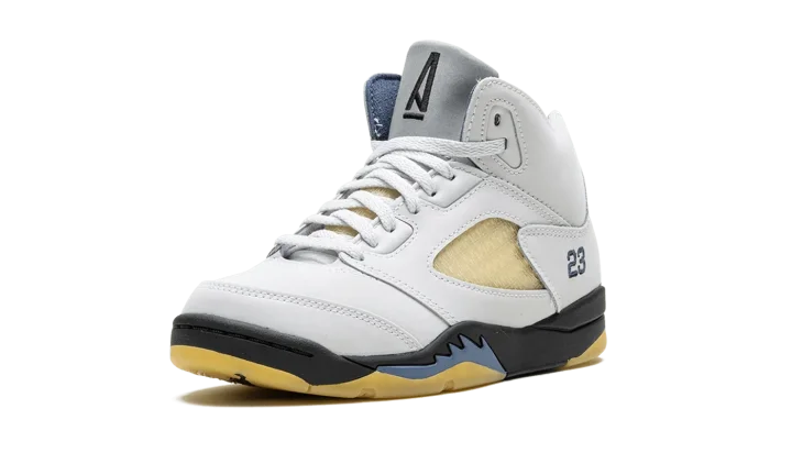 The A Ma Maniére x Air Jordan 5 SP PS "Dawn" is the preschool sizing of the fifth Air Jordan from the collaboration by James Whitner's boutique. Since the late 2010s, A Ma Maniére has been one of the most successful collaborators in the sneaker space, having worked with Jordan Brand on several now-classic sneakers. For this child-sized Jordan 5, the upper features a white leather construction with pre-aged netting on the tongue and mid-panel designed in a pattern of A Ma Maniére's "A" logo. Jordan's "23" jersey number is embroidered on the lateral side of the heel. Yellow-tinted, semi-translucent rubber on the outsole continues the pre-aged look underneath the black midsole with blue shark tooth detailing. Release date: November 17, 2023