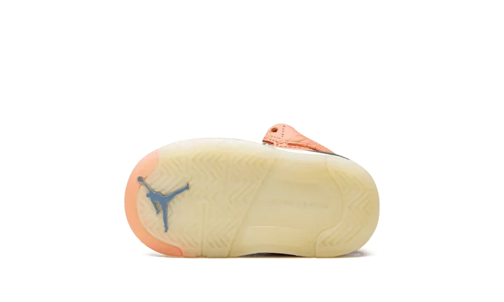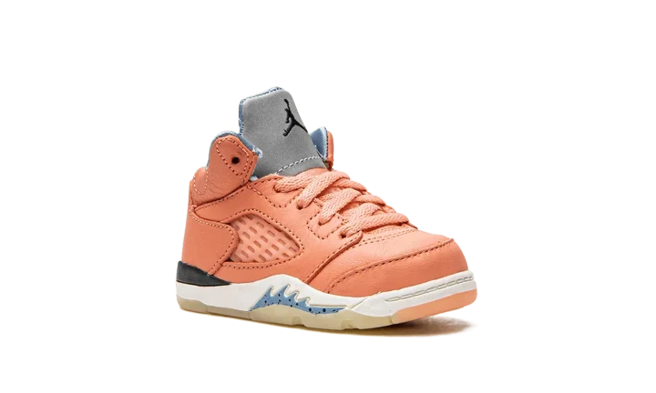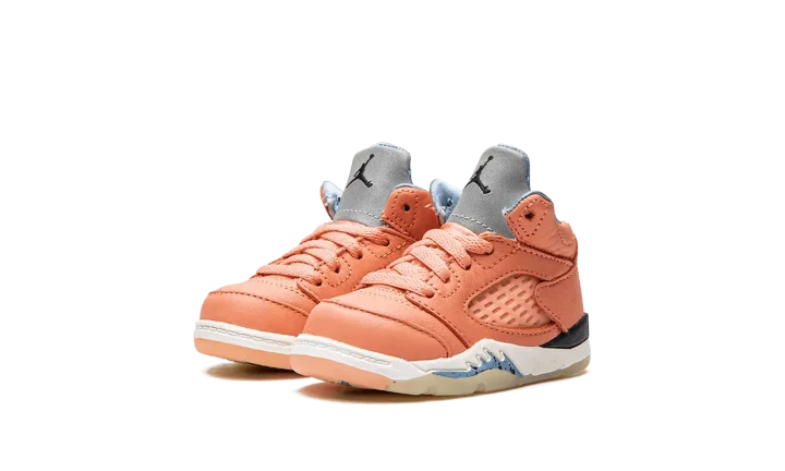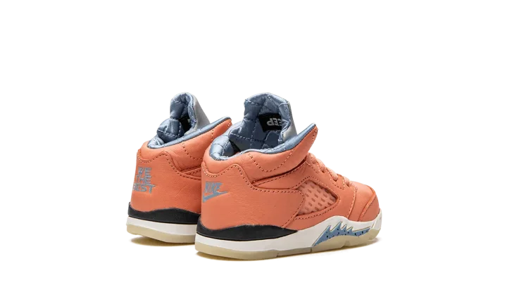 The DJ Khaled x Air Jordan 5 TD "Crimson Bliss" is the toddler sizing of the version of the retro basketball shoe designed by the hip-hop producer. From DJ Khaled's collection of pastel-colored Jordan 5s, the "Crimson Bliss" is inspired by Miami and warm weather, as the shoe's pink appearance undoubtedly calls to mind both the Florida city and its climate. The shoe features a Crimson Bliss leather construction with plastic netting on the mid-panel. Blue "West the Best" branding inspired by Khaled's catchphrase is stamped on the heel of the left shoe while the Jordan 5's original Nike logo is found on the right heel. The words "Keep" and "Going" are found on the underside of the blue quilted tongue tag. Classic Jumpman logo detailing appears on the Metallic Silver reflective tongue. Release date: November 28, 2022