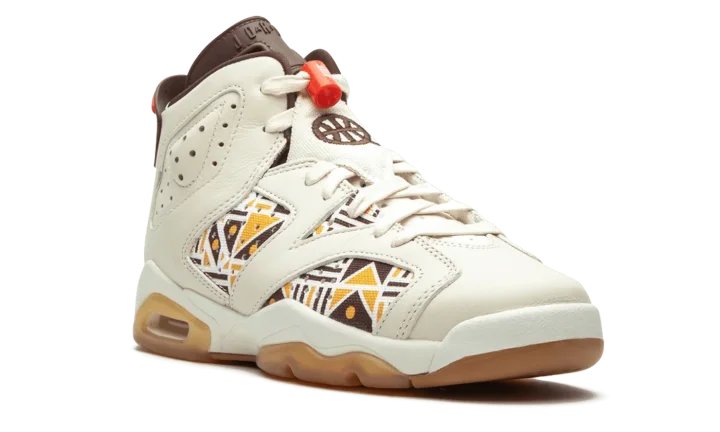 The Air Jordan 6 GS "Quai 54" is the grade school sizing of the design that coincides with Jordan Brand's annual streetball tournament in Paris, France. This colorway of Michael Jordan's sixth signature shoe features a Sail leather base with patterned textile panels on either side. Brown Jumpman embroidery appears on the cream colored nylon overlay on the tongue. A red lace toggle with white Jumpman branding and dual-branded "Nike Air" and "Quai 54" dots the left and right heel, respectively.