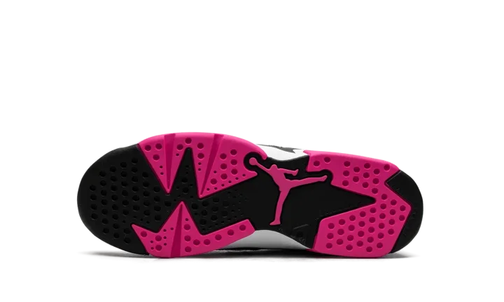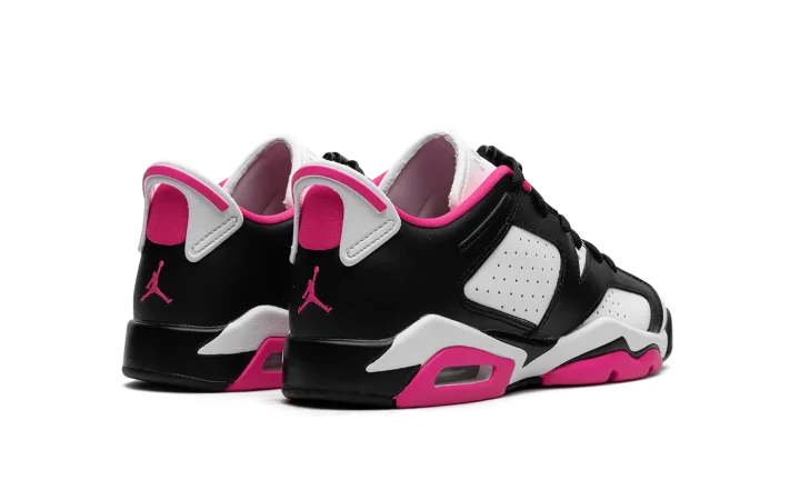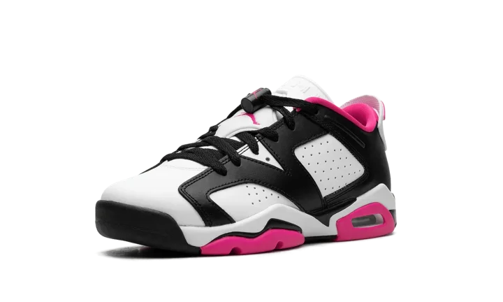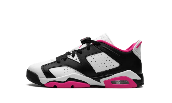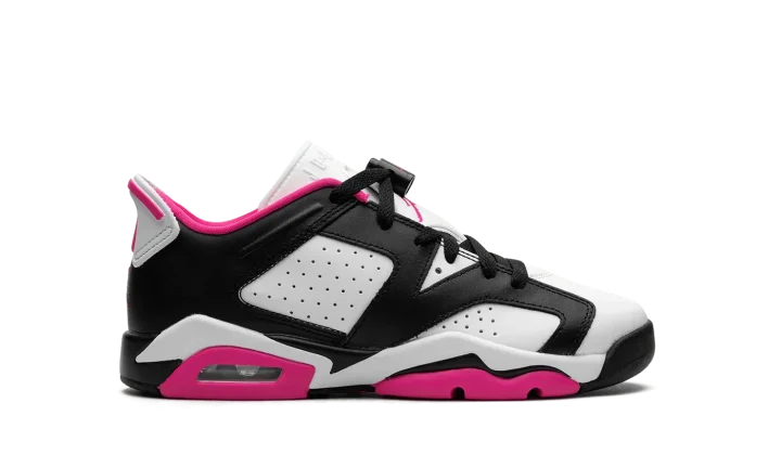 The Air Jordan 6 Low GS "Fierce Pink" is the youth sizing of the low-top retro basketball sneaker in a can't-miss colorway. The Jordan 6 Low "Fierce Pink" was released exclusively in children's sizes and features a white base contrasted with black leather overlays. Fierce Pink accenting lands on the Jumpman on the tongue, on the inner lining, on the pull tab on the heel, and on the outsole. Underfoot, the shoe is complete with a white rubber midsole that's placed on a black and pink rubber outsole. Release date: July 24, 2023