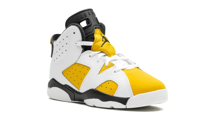 The Air Jordan 6 PS "Yellow Ochre" is the preschool sizing of the colorway of Michael Jordan's retro basketball sneaker with a white-and-yellow color scheme. Featuring the reconizable color block of the original "Carmine" Air Jordan 6, this "Yellow Ochre" colorway replaces all of the red accents with an earth tone shade of yellow. The yellow hue in question is found on the synthetic nubuck base of the shoe, along with white leather overlays and black detailing throughout. Release date: January 27, 2024
