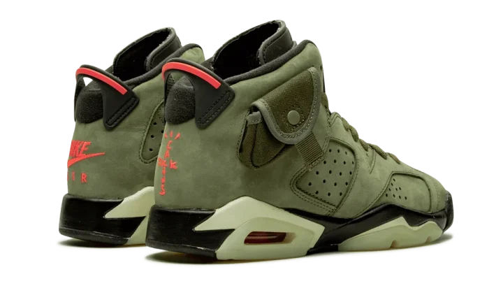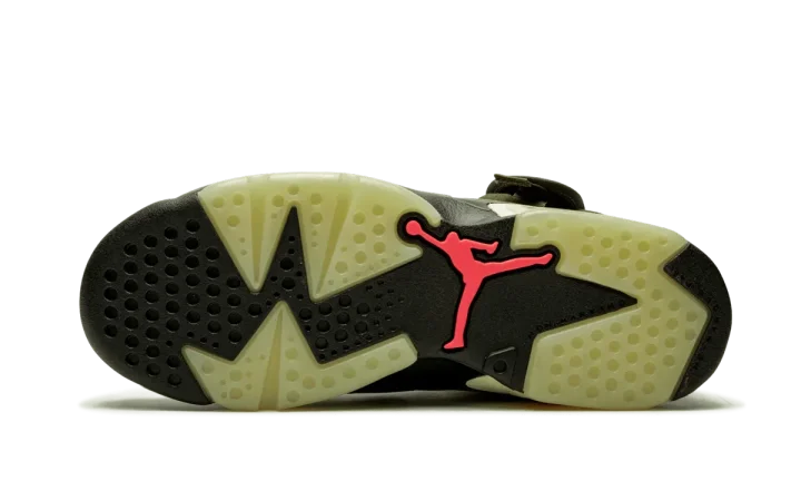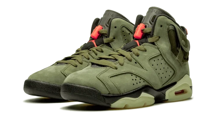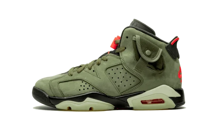 The Travis Scott x Air Jordan 6 GS is the children's sizing of the Houston rapper's coveted collaboration on Michael Jordan's sixth signature design with Nike. The Air Jordan 6 takes on an earthy aesthetic akin to both the high and low-top Air Jordan 1 designs imagined by Scott. Here, an olive green nubuck upper covers the mid-panel, toe, and heel. Drawing favorably from military influences, the design features an added stash pocket on the ankle collar that mirrors utilitarian cargo pants. Further contrasting includes embroidered orange Nike Air branding on the heel along with orange accenting on the heel tab, lace lock, and Jumpman branding that covers the black neoprene tongue. Finishing off the look of this limited high-top silhouette is a black mudguard and Sail midsole with a glow-in-the-dark translucent outsole. The Travis Scott x Air Jordan 6 in grade school sizing was released alongside the adult sizing in October 2019.