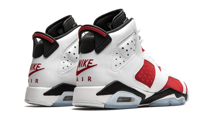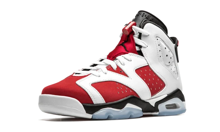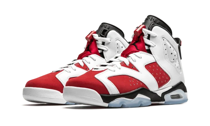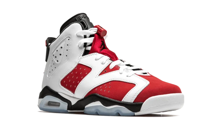 The Air Jordan 6 GS "Carmine 2021" is the youth sizing of an original colorway of Michael Jordan's sixth signature shoe that was re-released by Jordan Brand in 2021. This version of the "Carmine" brings back the original "Nike Air" branding on the back of the shoe for the first time since the colorway's debut all the way back in 1991. Subsequent "Carmine" releases in 2008 as part of the "Countdown Pack" and in 2014 featured a Jumpman on the heel, not the original "Nike Air" branding. The rest of the shoe retains the correct height and panel shapes as the inaugural release. White leather overlays on the forefoot, mid-panel, and eyelets contrast the red synthetic nubuck panels. Perforations on either side of the shoe and collar are true to the original design of the Air Jordan 6. A black liner and neoprene lace shroud with black Jumpman embroidery add to the model's distinct styling. The previously mentioned "Nike Air" detailing on the heel sits beneath a spoiler-style heel tab to complete the look. Release date: February 13, 2021.