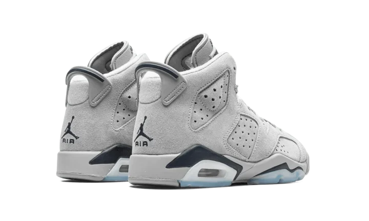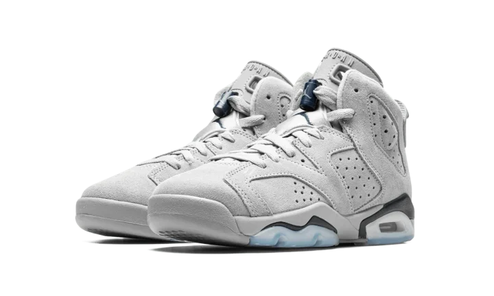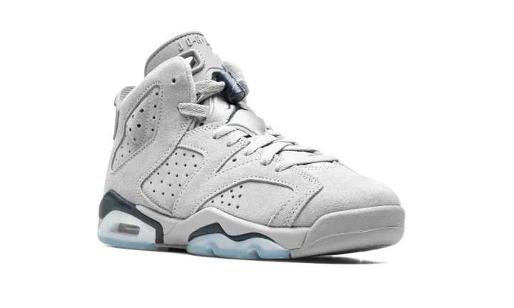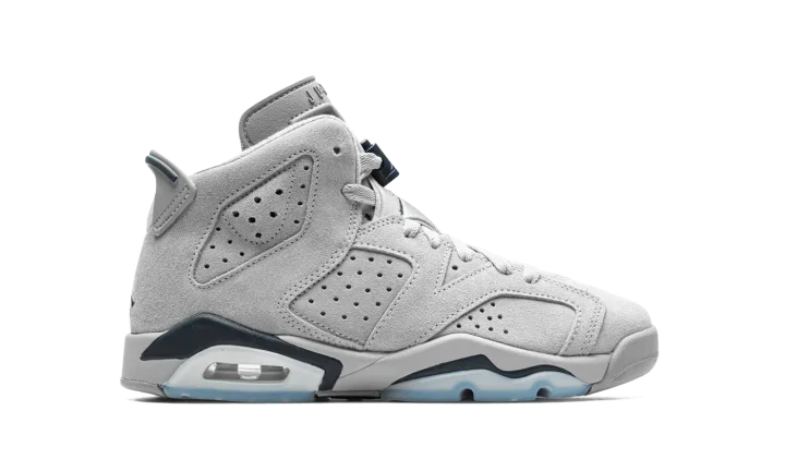 The Air Jordan 6 GS "Georgetown" is the youth sizing of the college basketball-inspired colorway of the retro basketball shoe. As its name implies, the Jordan 6 "Georgetown" looks to the Georgetown Hoyas college basketball team, specifically its grey and blue team uniforms, for inspiration. Although Jordan and the UNC Tar Heels defeated the Hoyas to win the NCAA Men's College Basketball Championship in 1982, that hasn't stopped Jordan Brand from using the popular basketball team's uniform colors on several great Jordan shoes, including this Jordan 6. The upper features a grey suede construction with contrasting Midnight Navy accenting on the heel "spoiler," lace toggle, and on the Jumpman on the back of the shoe. Additional navy detailing appears on the painted mudguard above the semi-translucent panel on the forefoot and heel of the midsole. Release date: September 3, 2022