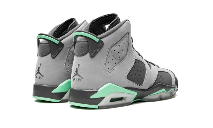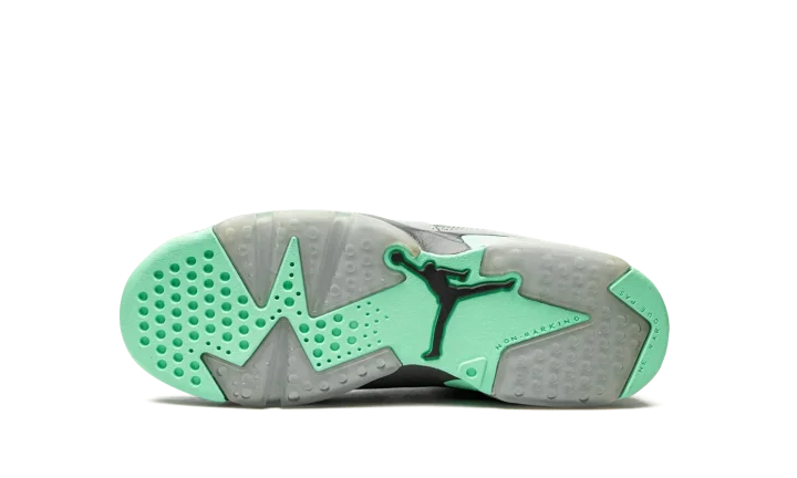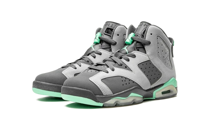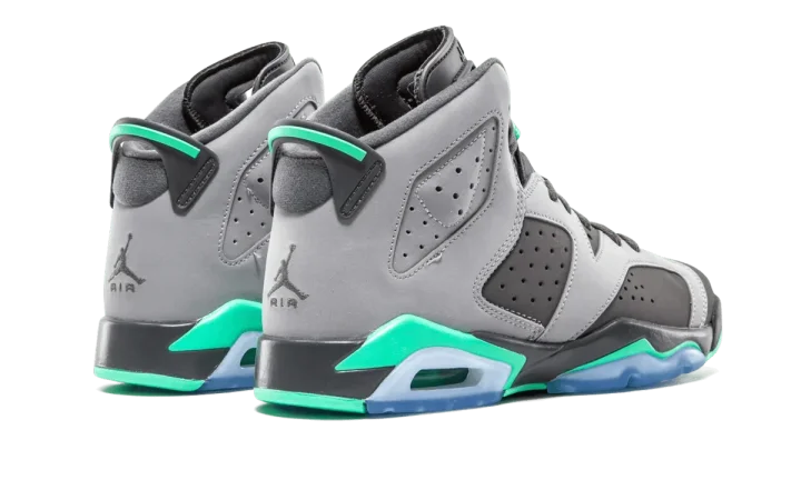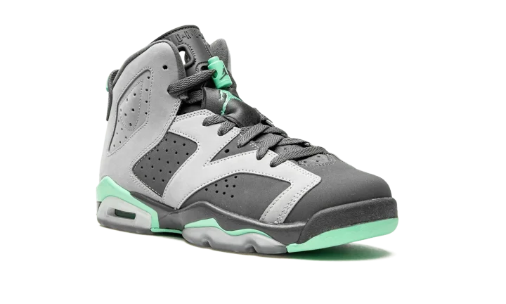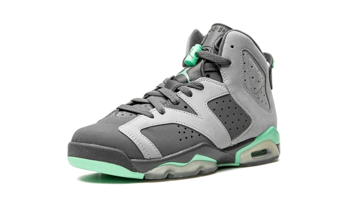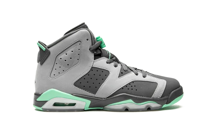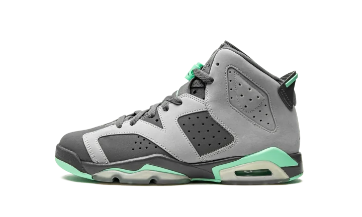 The popular "Green Glow" makeup made its way to the Air Jordan 6 in 2016. Designed for grade school girls (GG), the Air Jordan 6 "Green Glow" features a predominantly grey synthetic nubuck upper with Green Glow accents throughout. Icy clear rubber portions of the outsole complete the clean look.