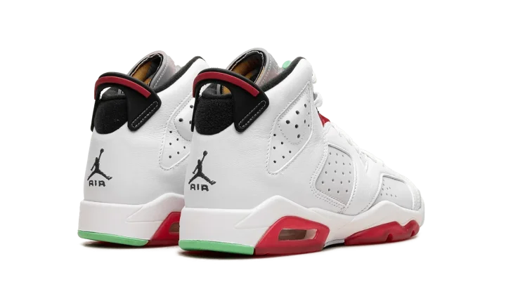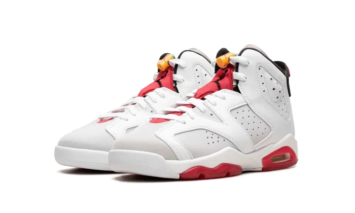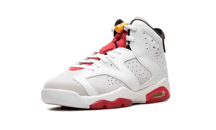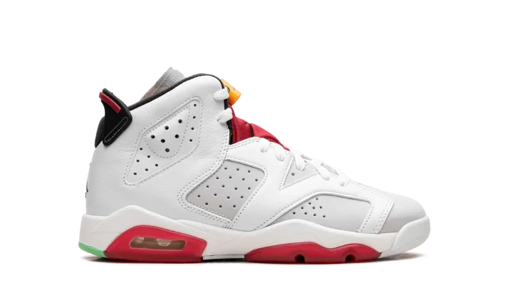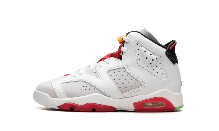The Air Jordan 6 GS "Hare" is the grade school youth sizing of the shoe that pays homage to another classic Jordan model: the original Air Jordan 7 "Hare." The early '90s design gained popularity thanks to the memorable television commercials starring Michael Jordan and Bugs Bunny and, now, reappears with a modern twist as Jordan Brand honors the legacy of "His Airness'" sneaker collection. A light grey perforated synthetic nubuck material forms the base of the shoe, appearing on the mid-panel and toe. White leather overlays along the forefoot, mid-panel, and heel are accented by the red neoprene lace cover with black Jumpman branding. A multicolor geometric pattern is placed below the clear rubber tongue. Additional styling cues include an orange and green lace lock that resembles a carrot, an embroidered black Jumpman on the heel, and red translucent rubber detailing on the sole. Release date: June 12, 2020.