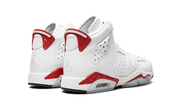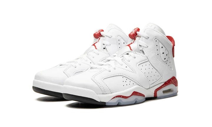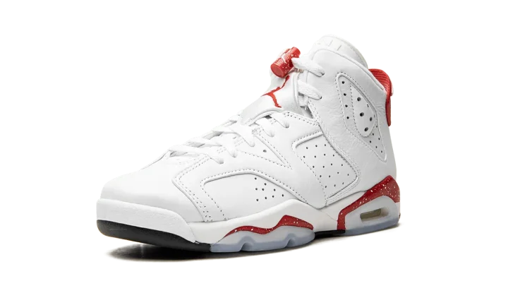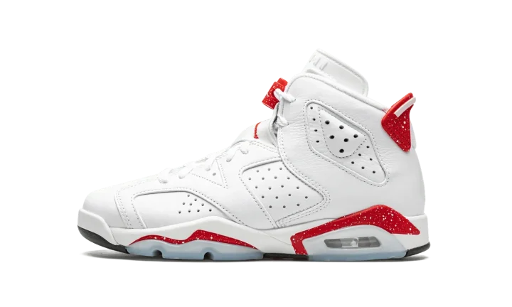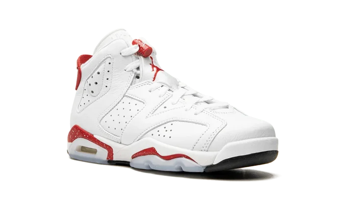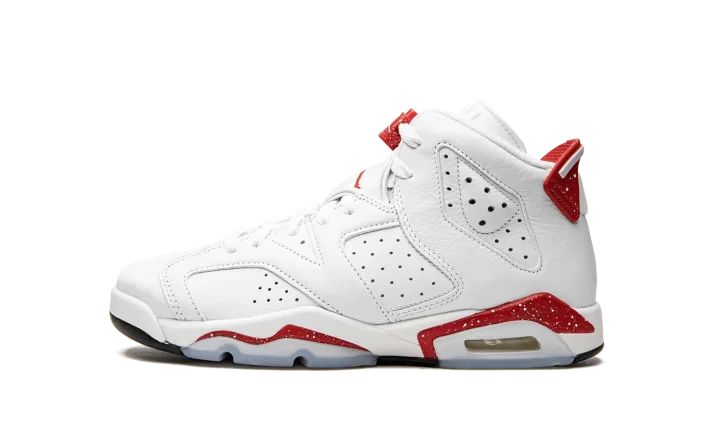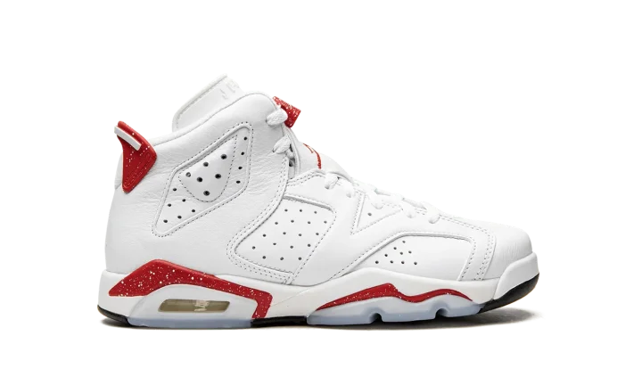 The Air Jordan 6 GS "Red Oreo" is the youth sizing of the colorway of the vintage basketball shoe that unofficially nods to the popular snack of the same nickname. Jordan Brand's "Oreo" color story continues on the Jordan 6 "Red Oreo." The "Red Oreo," specifically, seemingly shows love to the Red Velvet Oreo flavor, sans any official Oreo branding or likeness. The upper features a white leather construction that gives way to contrasting University Red accents. The fiery shade of red is found on the midsole and spoiler, both with white speckle detailing, and on the embroidered Jumpman on the lace shroud and lace toggle. A tonal Jumpman logo is stitched onto the heel. Release date: June 4, 2022