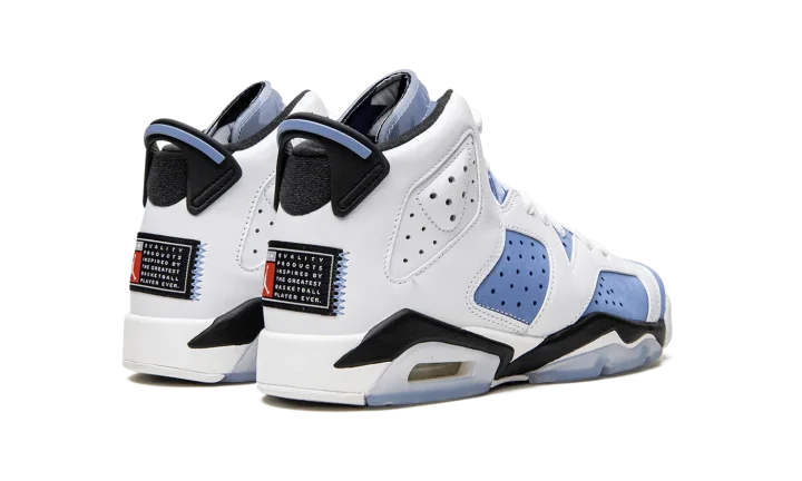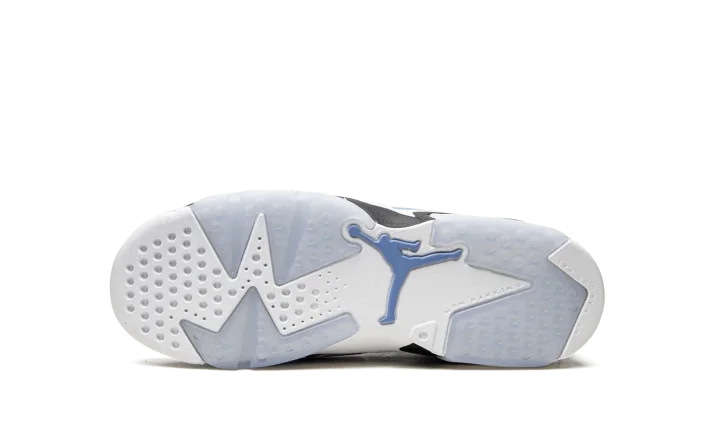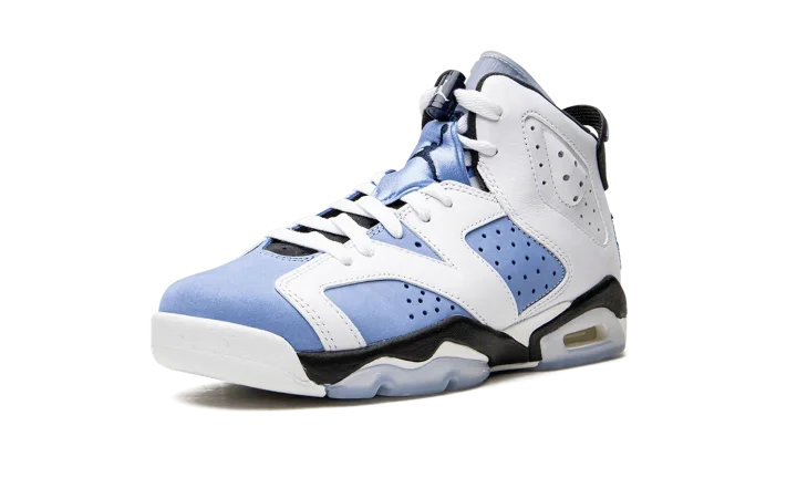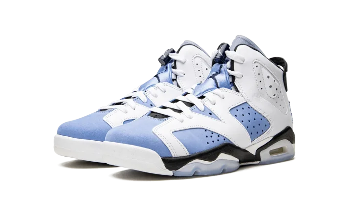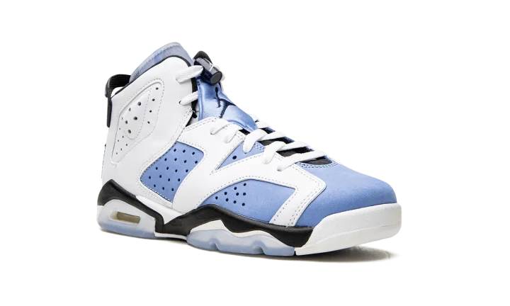 The Air Jordan 6 GS "UNC" is the youth sizing of the collegiate-inspired colorway of Michael Jordan's retro basketball shoe that nods to Jordan's alma mater. From March 2022, the Jordan 6 GS "UNC" is yet another colorway from Jordan's signature shoe collection that employs the team uniform colors of the North Carolina Tar Heels on its design, and it doesn't disappoint. The "UNC" mirrors the color block of the Jordan 6's original "Carmine" colorway from 1991. The University Blue synthetic nubuck base gives way to contrasting white leather overlays on the shoe's upper. The neoprene lace overlay that is complete with black Jumpman branding is designed in University Blue, as well. Additional baby blue accenting appears on the spoiler on the back of the shoe and on the tongue. An embroidered "Team Jordan" patch on the heel is inspired by product tags found on the bottom of basketball jerseys. Release date: March 5, 2022
