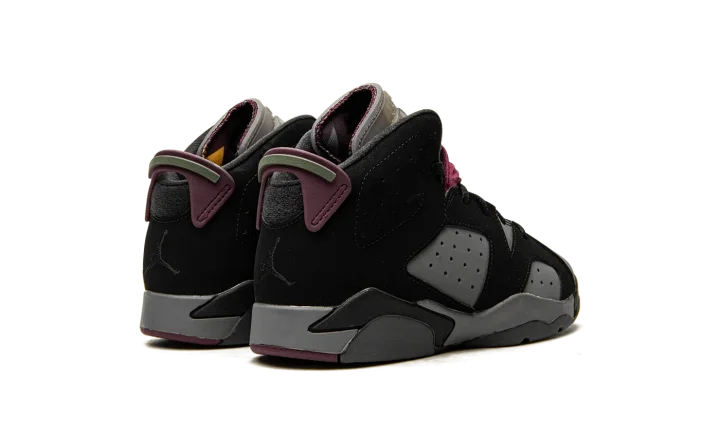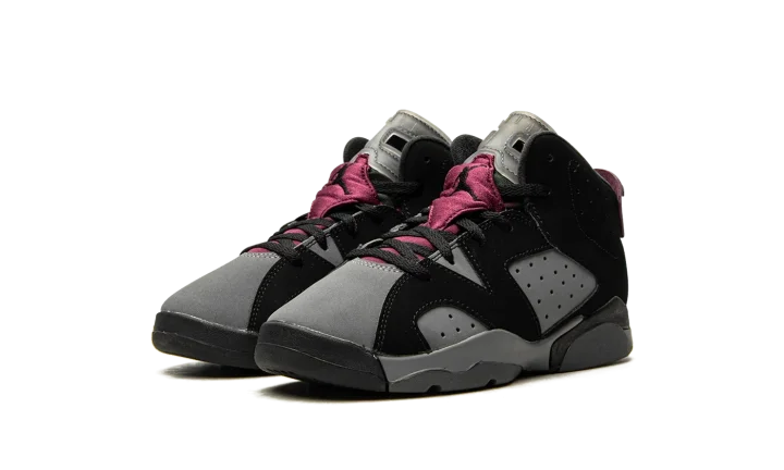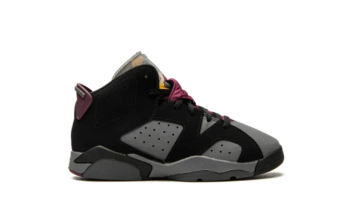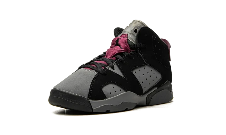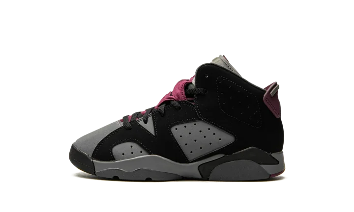 The Jordan 6 PS "Bordeaux" is the preschool sizing of Michael Jordan's sixth signature shoe in a design that salutes the original Air Jordan 7 colorway of the same nickname. One of the most popular Air Jordan looks ever, the Jordan 7 "Bordeaux" was worn by Michael during the '92 NBA All-Star Game. Here, Jordan Brand salutes the iconic look by applying the first "Bordeaux's" color scheme to the Air Jordan 6 as part of the shoe's 30th anniversary. Released in September 2021, the modern "Bordeaux" is complete with a grey synthetic nubuck base with perforations on either side. Contrasting black overlays break up the look. Bordeaux accenting is found on the neoprene tongue with black Jumpman branding and on the spoiler on the heel. "Air Jordan" branding appears on the semi-translucent tongue tab and a black Jumpman is stitched onto the back of the shoe. Release date: September 4, 2021