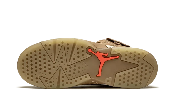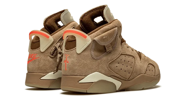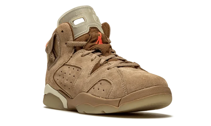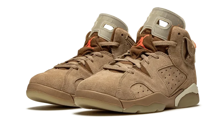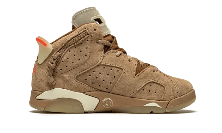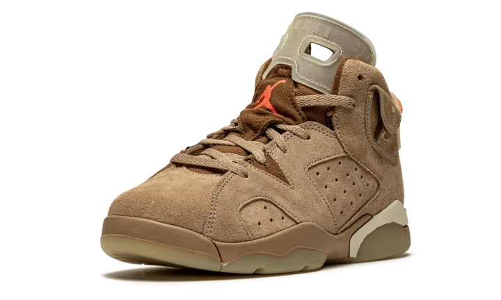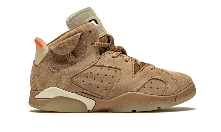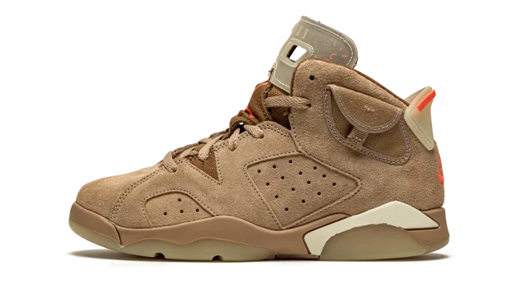 The Travis Scott x Air Jordan 6 PS "British Khaki" is the preschool sizing of the hip-hop star's second edition of Michael Jordan's sixth signature shoe. From Spring 2021, Travis Scott's extremely hyped Jordan 6 "British Khaki" succeeds the military inspired "Cactus Jack" colorway produced by Scott and Jordan Brand in 2019. The upper on the "British Khaki" features a monochromatic brown suede construction. An orange embroidered Jumpman is embroidered onto the dark brown canvas tongue. Like Scott's first Jordan 6 design, the "British Khaki" dons an added stash pouch on the collar, a utilitarian design meant to mimic the kinds of pockets that can be found on the side of cargo pants and military gear. A zip pocket appears on the lateral side of the collar and provides the wearer with additional storage. Embroidered Nike and "Cactus Jack" branding can be found on the back of the left and right shoe, respectively. Finishing touches include a light brown mudguard and a glow-in-the-dark translucent outsole.