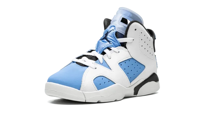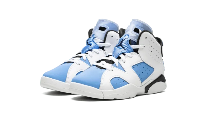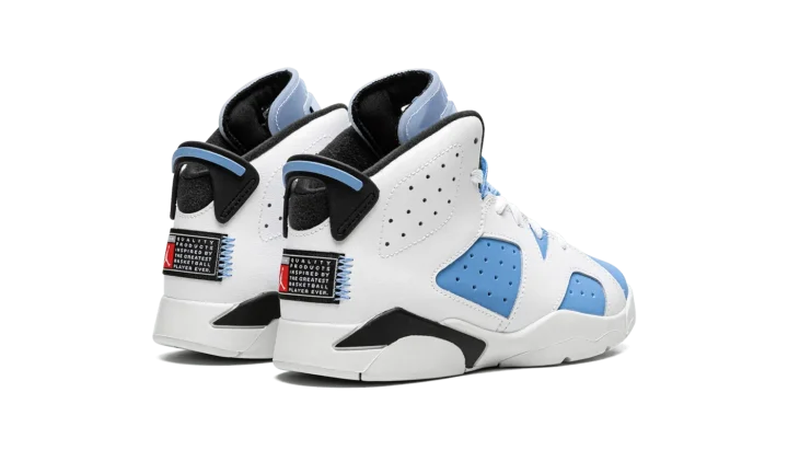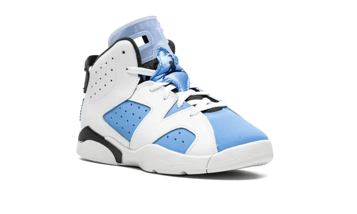The Jordan 6 TD "UNC" is the toddler sizing of Michael Jordan's sixth signature shoe in a colorway that celebrates his alma mater, the North Carolina Tar Heels. The "UNC" Jordan 6 is yet another popular colorway from Jordan's signature shoe collection that employs the team uniform colors of the Tar Heels on its design, and the first Jordan 6 colorway to do so. The "UNC" replicates the color block of the Jordan 6's original "Carmine" colorway from 1991. The University Blue synthetic nubuck base is contrasted by white leather overlays on the shoe's upper. The neoprene lace shroud with black Jumpman branding is designed in University Blue, as well. An embroidered "Team Jordan" patch on the heel is inspired by product tags found on the bottom of basketball jerseys. Release date: March 5, 2022