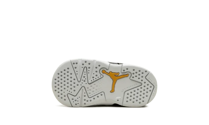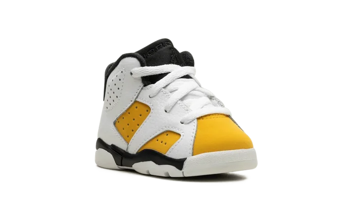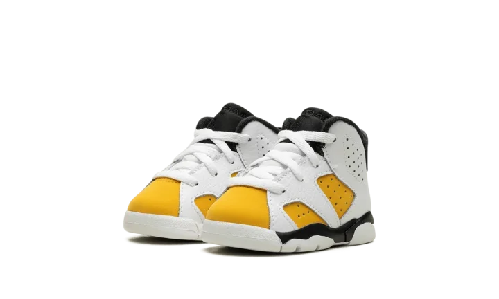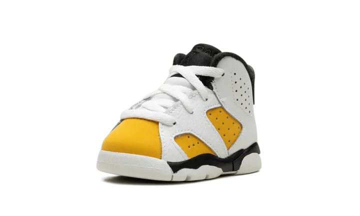 The Air Jordan 6 TD "Yellow Ochre" is the toddler sizing of the yellow-and-white colorway of the retro basketball shoe. The "Yellow Ochre" has the same color block as the Air Jordan 6's original "Carmine" colorway from 1991, but with yellow accents where the "Carmine" has red details. Specifically, the shoe features a Yellow Ochre nubuck base and contrasting white tumbled leather overlays. Yellow Ochre accenting can be found on the Jumpman on the heel and on the heel spoiler. Underfoot, the black mudguard contrasts the white sole. Release date: January 27, 2024
