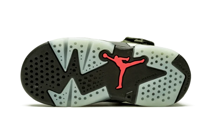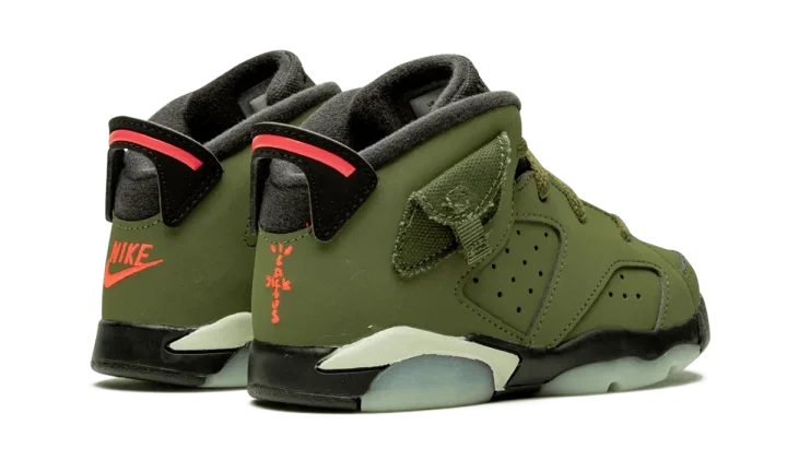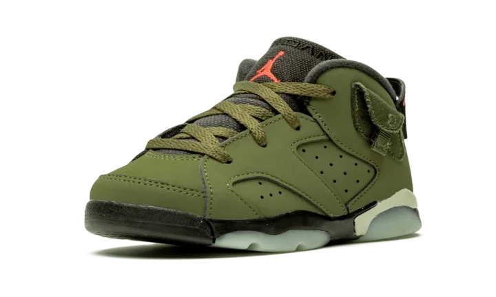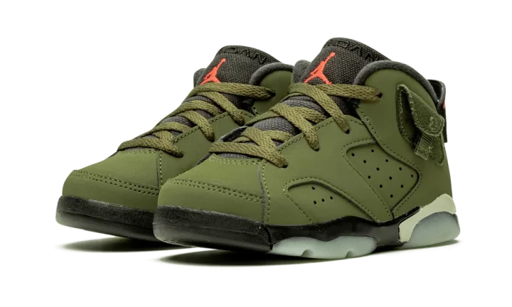 Product Description Writer Custom Gem Introduce your little one to iconic style with the Travis Scott x Air Jordan 6 TD. This toddler version of the celebrated collaboration brings the heat to tiny feet. Featuring a rich olive nubuck upper with perforations, these sneakers offer a premium look and feel. Orange accents pop on the embroidered Jumpman branding at the tongue, while Nike Air and Cactus Jack details adorn the heels. Just like the adult version, these toddler shoes boast a cargo pocket with a snap closure at the ankle collar, inspired by military apparel. A black rubber midsole with translucent glow-in-the-dark accents completes the design. Get your little one ready to step out in style with these exclusive sneakers.