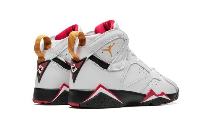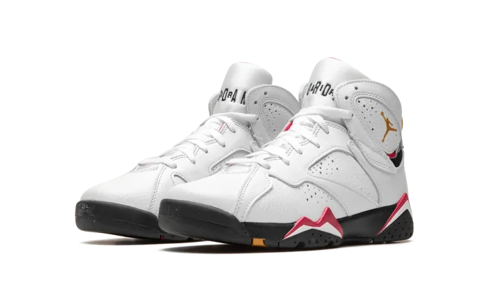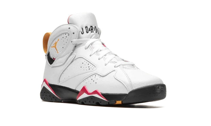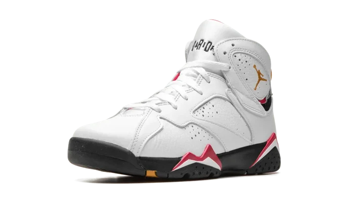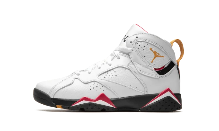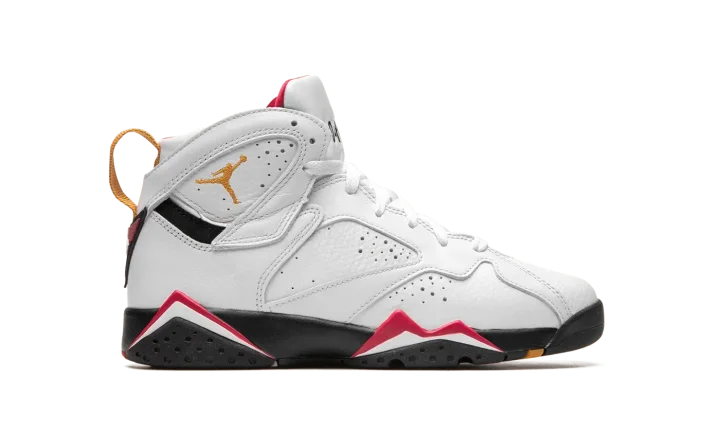 The Air Jordan 7 GS "Cardinal 2022" is the youth sizing of an original colorway of Michael Jordan's seventh signature shoe that debuted in 1992 and was re-released in November 2022. Jordan Brand honored the Jordan 7's 30th anniversary by bringing back several iconic colorways from back in the day, including the "Cardinal" style that Jordan wore with the Chicago Bulls. The shoe features a white leather upper with perforations on the sides. A bronze-colored embroidered Jumpman is found on the collar. Classic "23" branding is found on the heel beneath the yellow nylon pull tab. "Air Jordan" detailing appears on the tongue. The black midsole is accented with Cardinal Red and white. Release date: November 26, 2022