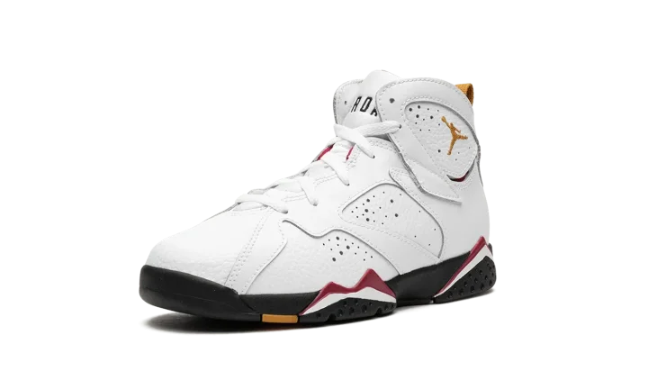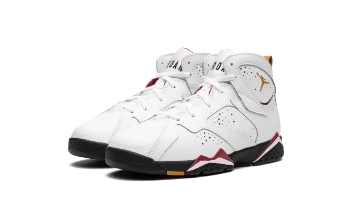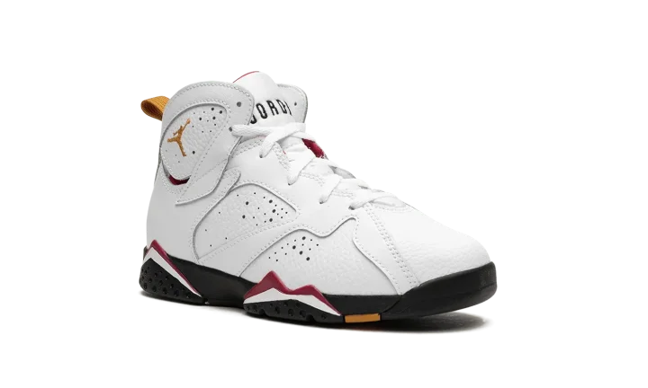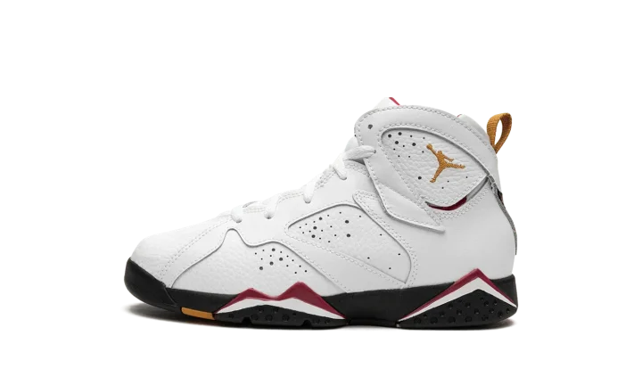 The Air Jordan 7 PS "Cardinal 2022" is the alternate preschool sizing of an original colorway of Michael Jordan's retro basketball shoe that debuted in 1992 and was re-released in true-to-original form in November 2022. Jordan Brand honored the Jordan 7's 30th anniversary by bringing back several iconic colorways from back in the day, including the "Cardinal" style that Jordan wore with the Chicago Bulls. The shoe features a white leather upper with perforations on the sides. A bronze-colored embroidered Jumpman is found on the collar. Classic "23" branding is found on the heel beneath the yellow nylon pull tab. "Air Jordan" detailing appears on the tongue. The black midsole is accented with Cardinal Red and white. Release date: November 26, 2022