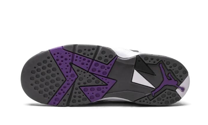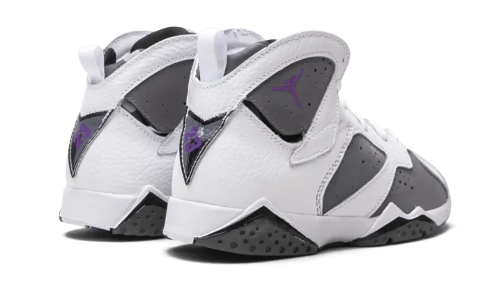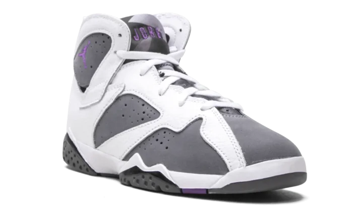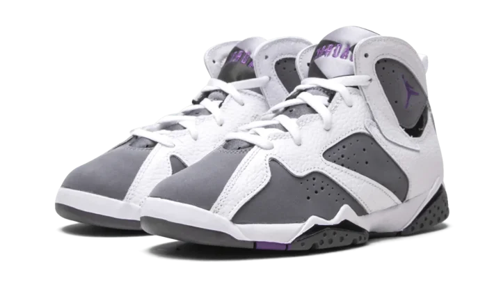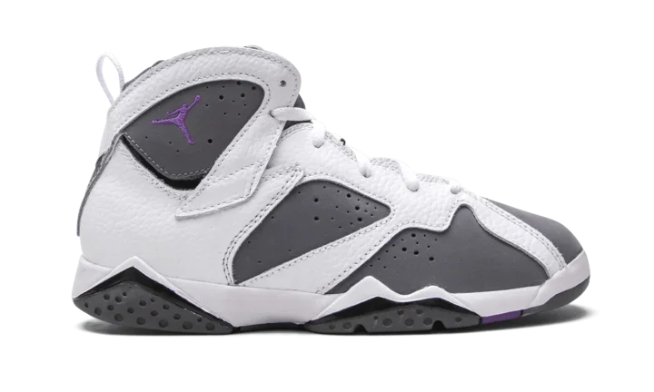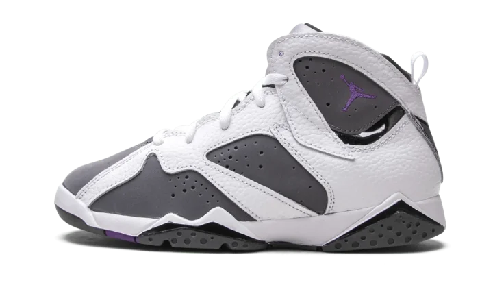 The Air Jordan 7 PS "Flint 2021" gives little preschoolers a chance to rock a re-release of the colorway of Michael Jordan's seventh signature shoe that was originally introduced by Jordan Brand in 2006. A mini-version of the adult silhouette, this shoe features an upper with a plush grey suede construction. White leather overlays on the forefoot, eyelets, mid-panel, collar, and heel provide a stark contrast in design. A purple embroidered Jumpman appears on the collar and purple "Air Jordan" detailing is stitched onto the multicolor nylon tongue. The Jordan 7's sock-like bootie provides the wearer with a comfortable yet supportive fit.
