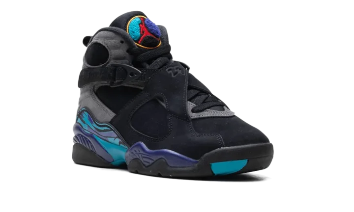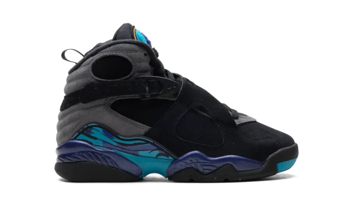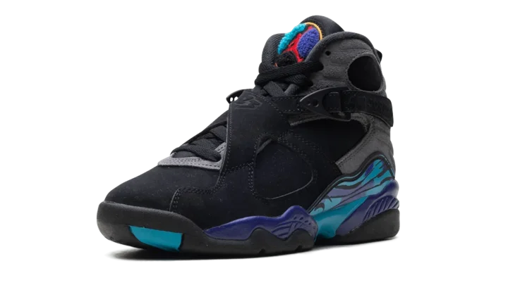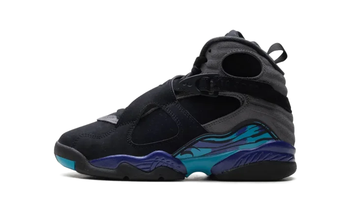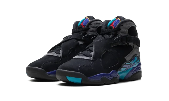 Step into a vibrant throwback with the Air Jordan 8 Retro GS "Aqua". This celebrated shoe for grade schoolers features the original black, aqua, and purple color scheme. Its unique crossover strap system ensures a supportive fit, blending heritage design with fun style. Enjoy comfortable Air cushioning, perfect for making a bold statement at school or play.