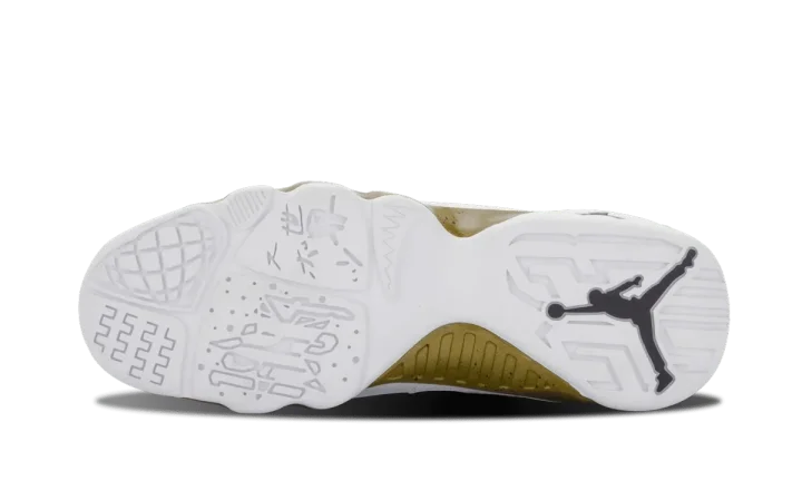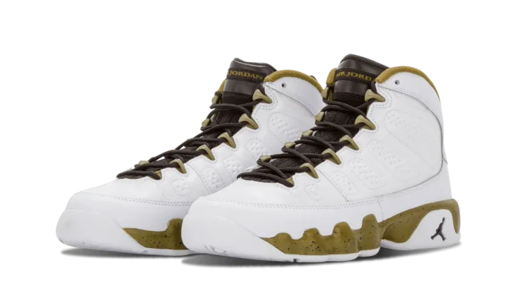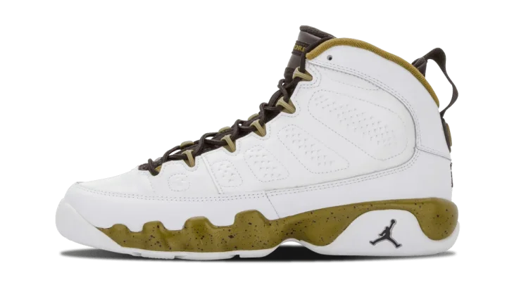 This 2015 release of the Air Jordan 9 is inspired by the bronze Michael Jordan statue outside of the Chicago Bulls home arena, which depicts His Airness in the Jumpman pose wearing the Air Jordan 9. The tribute to Michael built after his first retirement in 1994 is translated into this colorway with a speckled bronze-colored midsole. This listing is for Grade School sizing only.