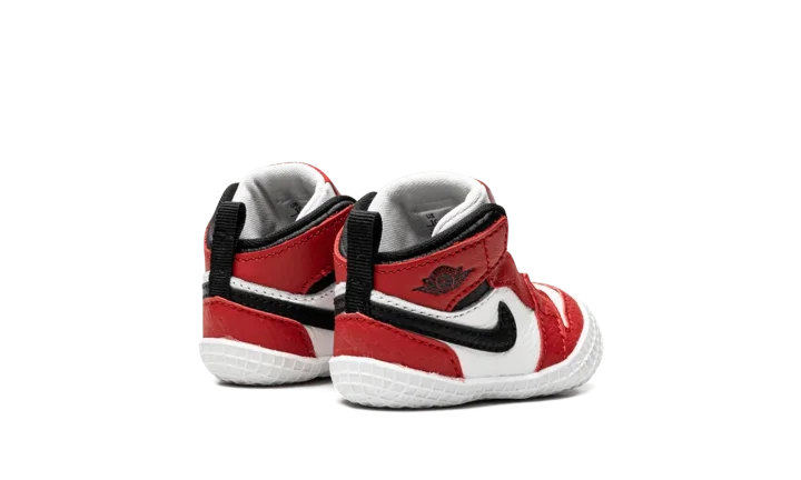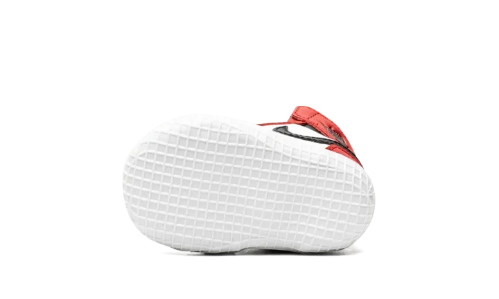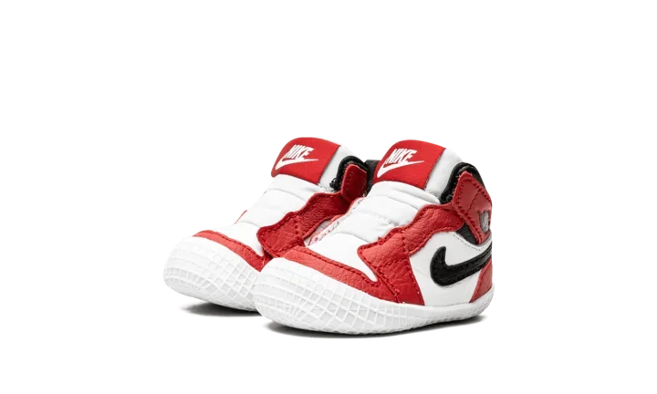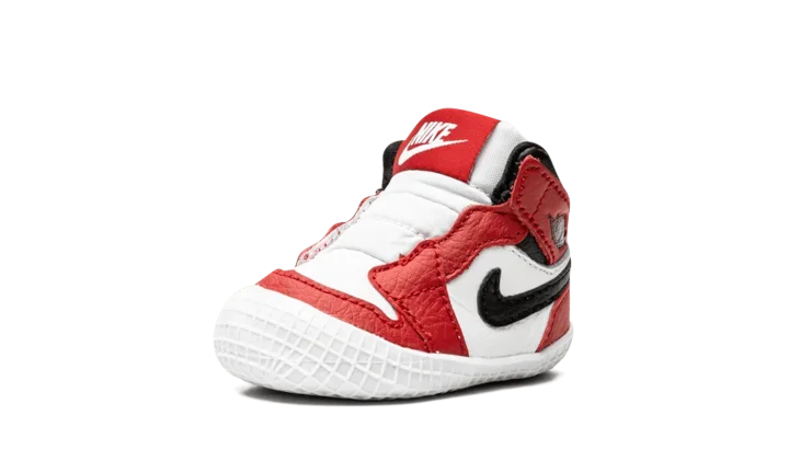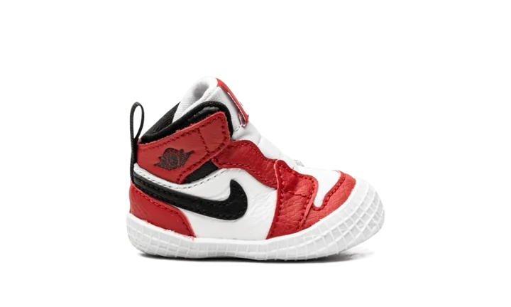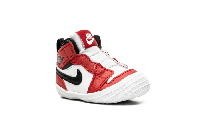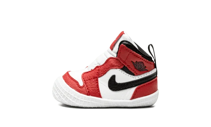 The Jordan 1 Crib Bootie "Chicago" is a miniature version of the iconic, original colorway of Michael Jordan's first signature shoe for infants. The "Chicago" edition of the Air Jordan 1 was worn by Jordan during his rookie season in the NBA with the Chicago Bulls in 1984-85 and is considered among the very best and most desirable sneakers in the world. Here, Jordan Brand shrinks the look down in size to fit the tiny feet of babies. The toe and mid-panel are constructed in white leather, which allows for the red leather overlays and black Swoosh branding to pop against the neutral base. A black "Wings" logo appears on the collar and a classic white Nike logo with a Swoosh is found on the red nylon tongue tag. Sans laces, the Jordan 1 Crib Bootie is an easy-wearing slip-on shoe for infants.