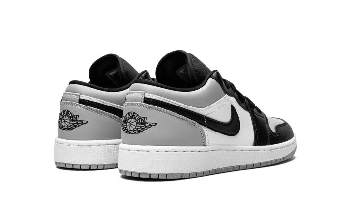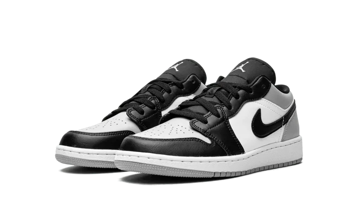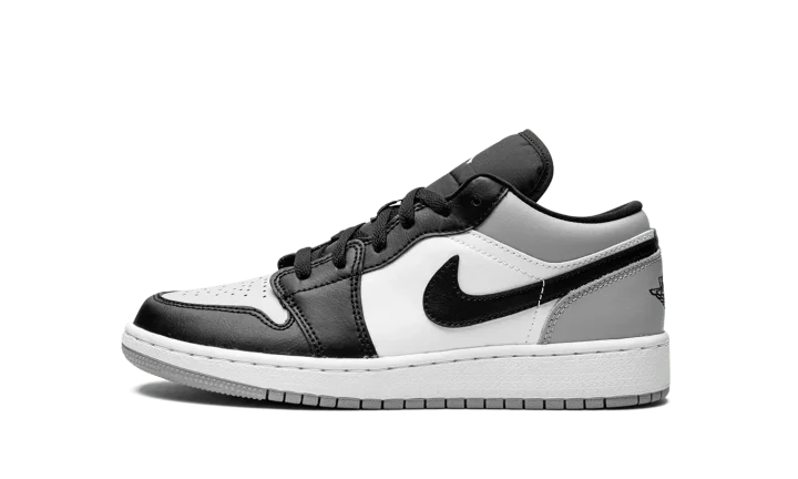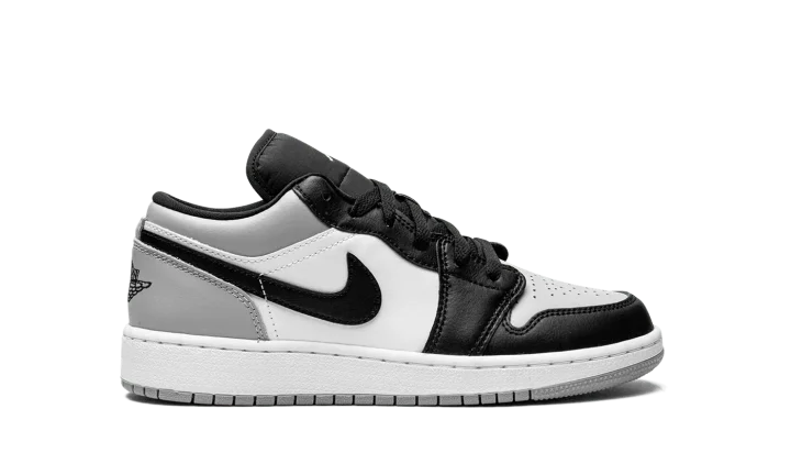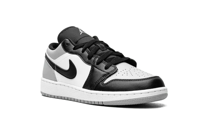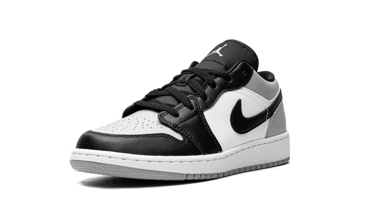 The Air Jordan 1 Low GS "Shadow Toe" is the youth sizing of the retro basketball shoe in a colorway that shows appreciation for the Jordan 1's original "Black Toe" makeup. The "Shadow Toe" features the same color block as the Jordan 1 "Bred Toe," a colorway of the shoe released back in 1985 and worn by Michael Jordan with the Chicago Bulls, except trades the original's red leather toe for Light Smoke Grey. The base of the shoe is designed in white leather. A black leather Swoosh resides on the sides and a black "Wings" logo is embroidered on the grey leather heel.