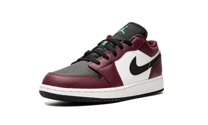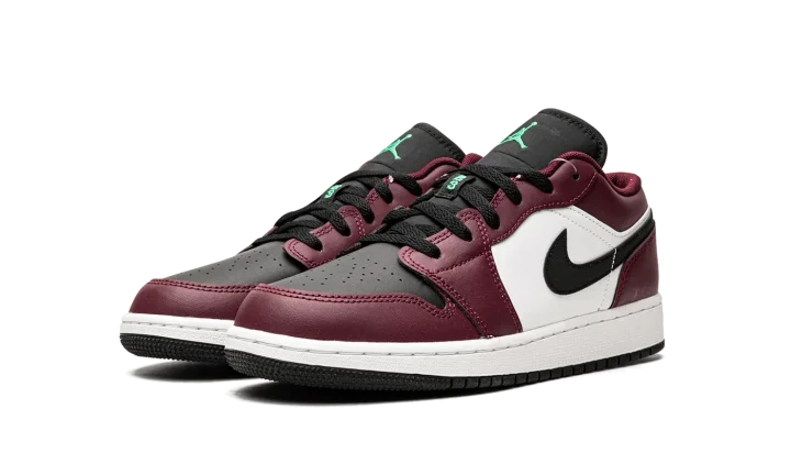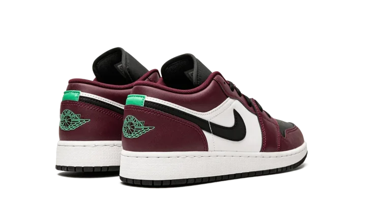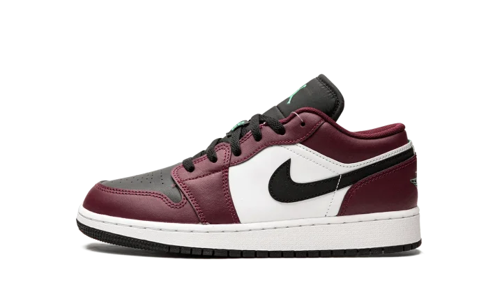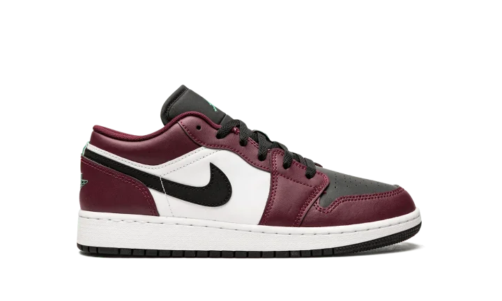 The Air Jordan 1 Low "Dark Beetroot/Roma Green" is a clean look for the classic silhouette, designed in a unique color combination. The Jordan Brand shoe features a white leather base accented by dark red at the toe box, ankle collar, and heel, along with black at the forefoot and tongue. Branding comes in the form of the usual midfoot Swoosh, Jumpman embroidery at the tongue, and Wings motif at the rear. Rounding up the design of the shoe is a pure white midsole and black rubber outsole.