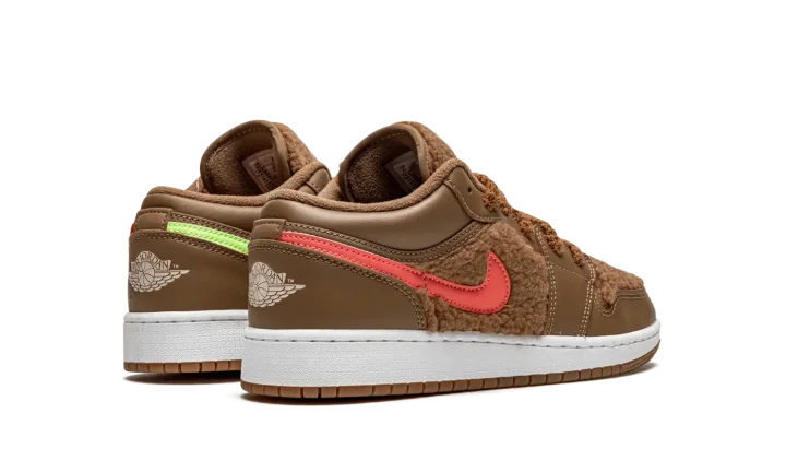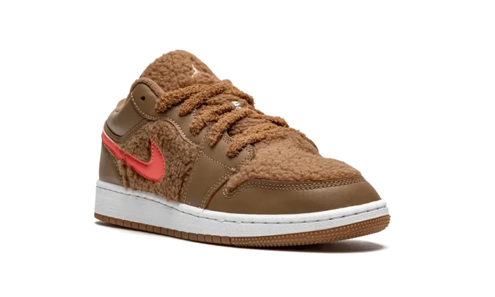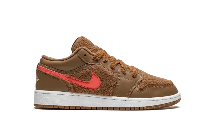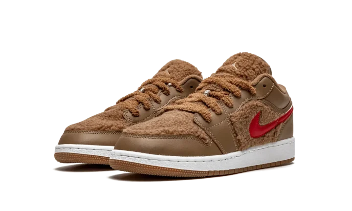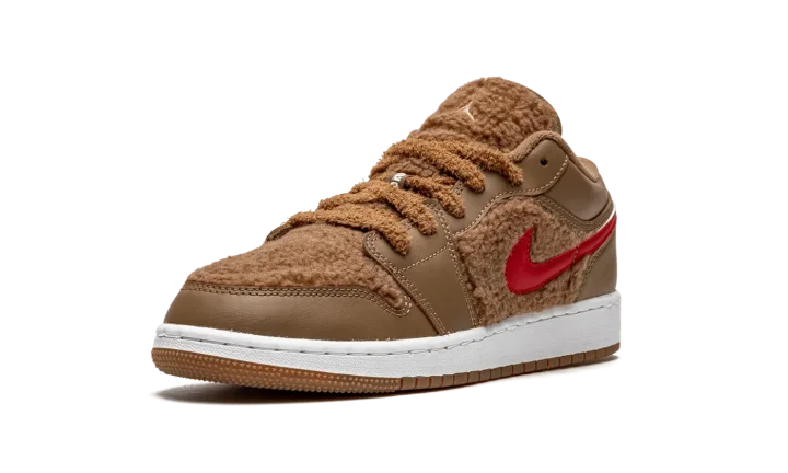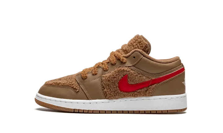 The Air Jordan 1 Low GS UTL "Teddy Bear" is a kids-exclusive colorway of Michael Jordan's first signature shoe in the popular low-top silhouette that looks to none other than plush teddy bears for design inspiration. A creative release from Jordan Brand, the "Teddy Bear" transforms the former basketball shoe into a fun-loving lifestyle design that any child would want to wear thanks to its fuzzy deep pile fleece in Driftwood on the toe, tongue and laces, and mid-panel. The same brown/tan hue appears on the leather overlays, the inner lining, and the rubber outsole. A red Swoosh is found on both sides and a white Wings logo is embroidered on the heel. Other details include a white Jumpman on the tongue, "23" branding on the lace overlay, and a white rubber midsole. Release date: October 29, 2021