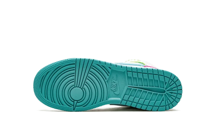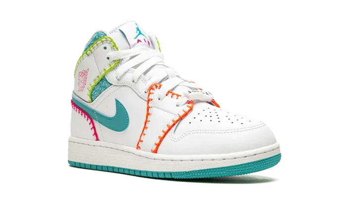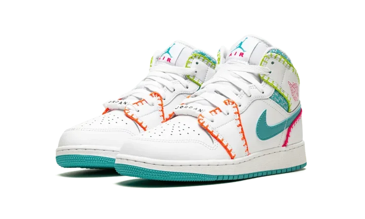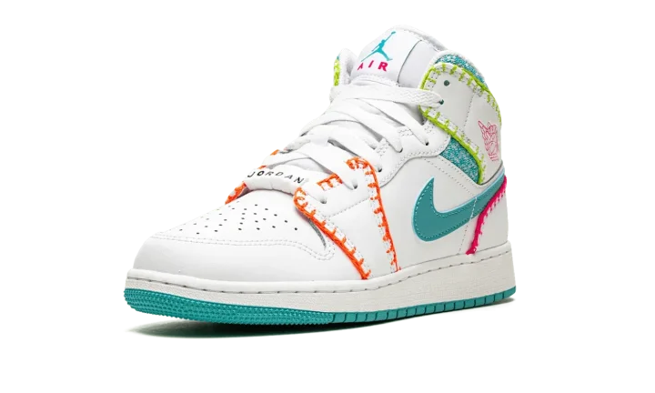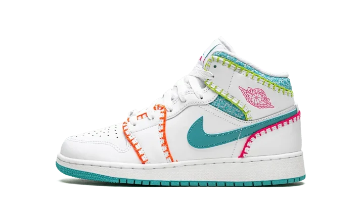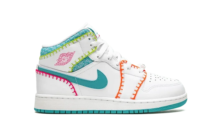 The Air Jordan 1 Mid GS "Multi-Knit" is the youth sizing of the mid-top lifestyle shoe in a colorway with a springtime vibe. Colorful accents abound on the "Multi-Knit" edition of the Jordan 1 Mid GS. The shoe's upper is constructed of white leather and features overlays accented with knit stitching in coral, pink, and lime green. The underlay panel on the collar is also designed in a knit textile, this time in blue. The same teal hue is used on the leather Swoosh that appears on either side of the shoe and on the Jumpman on the tongue. A pink "Wings" logo is found on the collar. The look is rounded into form with a lace dubrae with "JORDAN" branding in beaded letters.