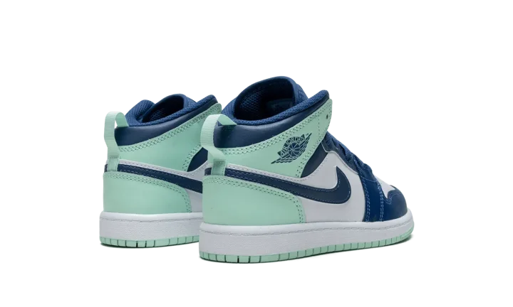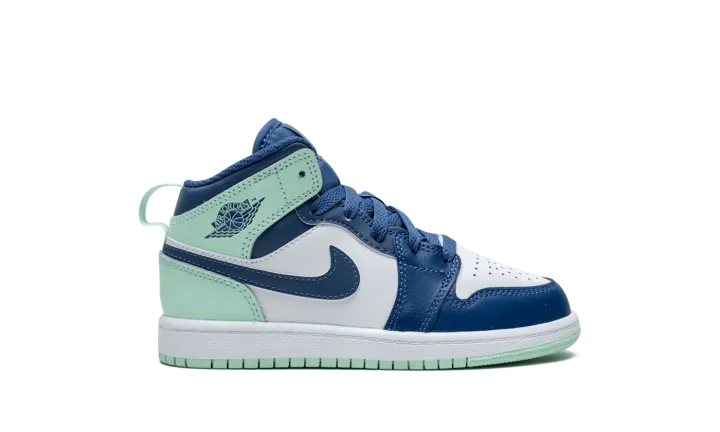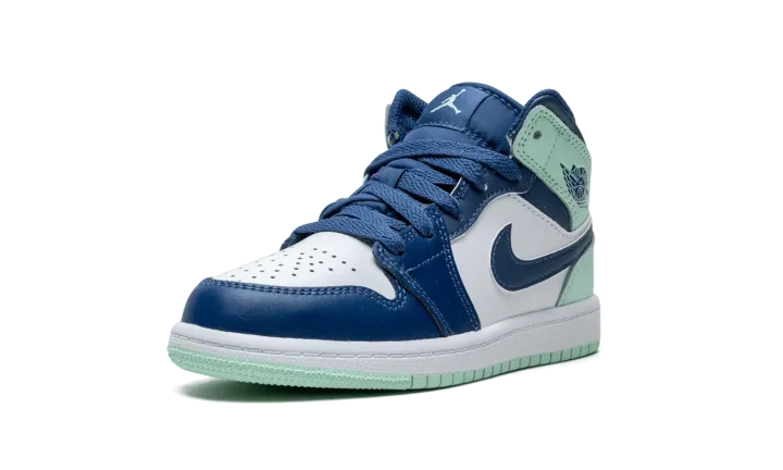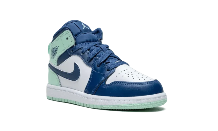 The Jordan 1 Mid PS "Blue Mint" is the preschool sizing of Michael Jordan's first signature shoe in a colorway that combines refreshing blue and mint green hues. The Jordan 1 Mid in "Blue Mint" is complete with a white leather base with Mystic Navy leather overlays on the toe cap, forefoot, and eyelets. The same shade of blue is also found on the leather Swoosh and on the "Wings" logo on the collar. Both the collar and heel panels are arranged in Mint Foam leather. As is the nylon pull tab on the heel that assists with on/off wearability.