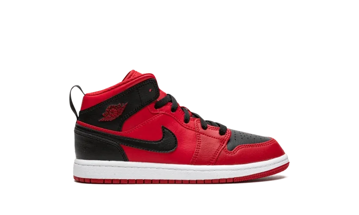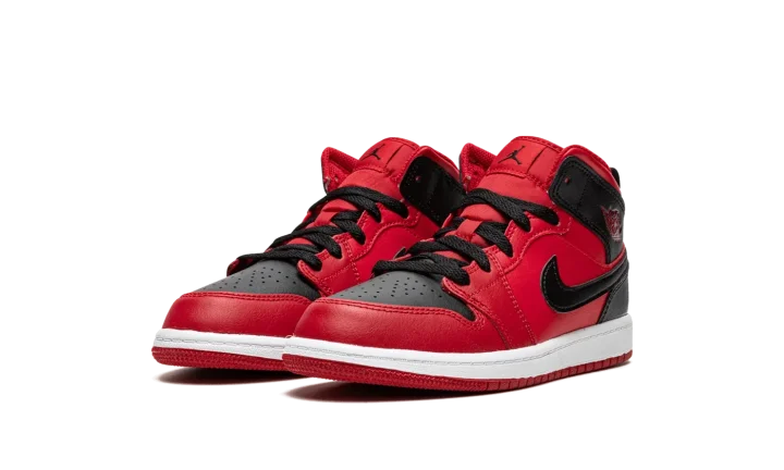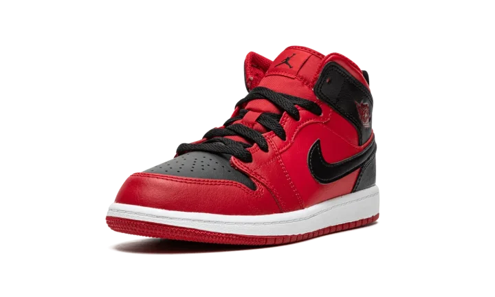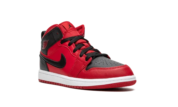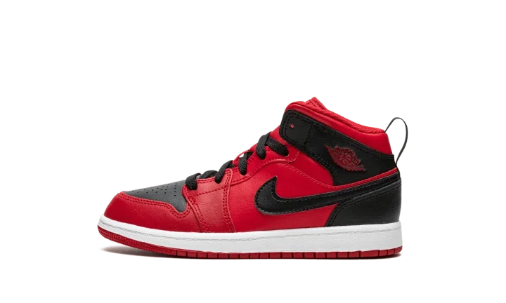 The Jordan 1 Mid PS "Reverse Bred" is the preschool sizing of the popular mid-top lifestyle shoe in a colorway that rearranges the original "Bred" Air Jordan 1 style. The original "Bred" colorway was released back in 1985, and serves as the inspiration for the "Reverse Bred" that, as its name implies, reversed the design's black-and-red look. The perforated toe, collar, and heel appear in black leather. Contrasting Gym Red leather is found on the overlays and on the mid-panel. A black leather Swoosh is located on either side of the shoe and a red "Wings" logo resides on the collar. Additional branding appears in the form of a black Jumpman on the tongue tag of the Gym Red-colored nylon tongue. A pull loop on the heel assists with easy on/off wearability.
