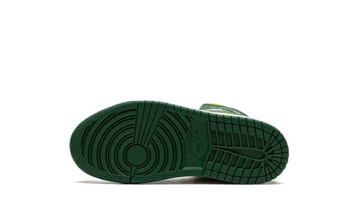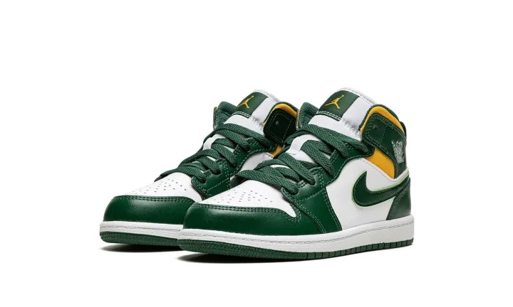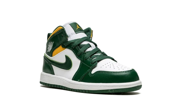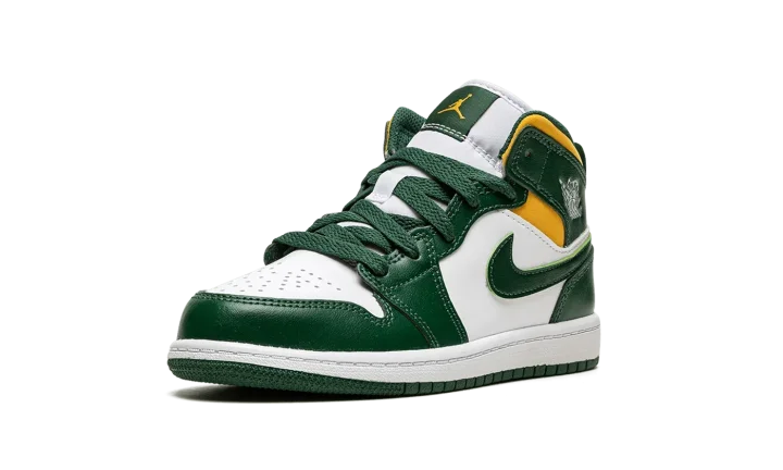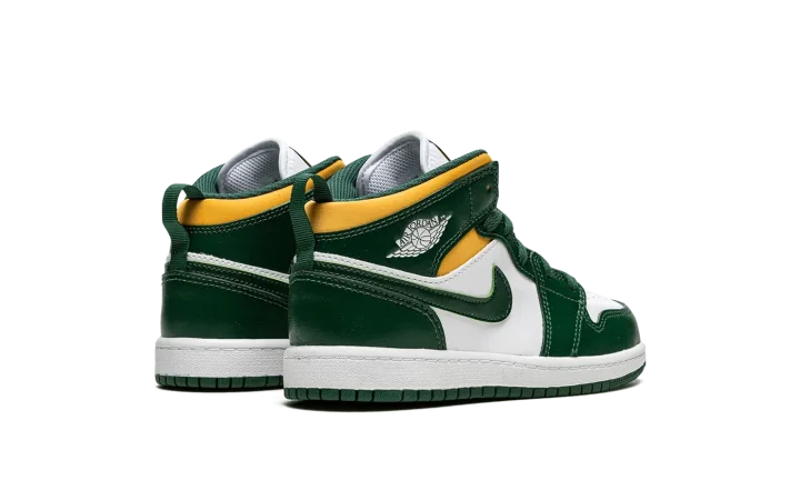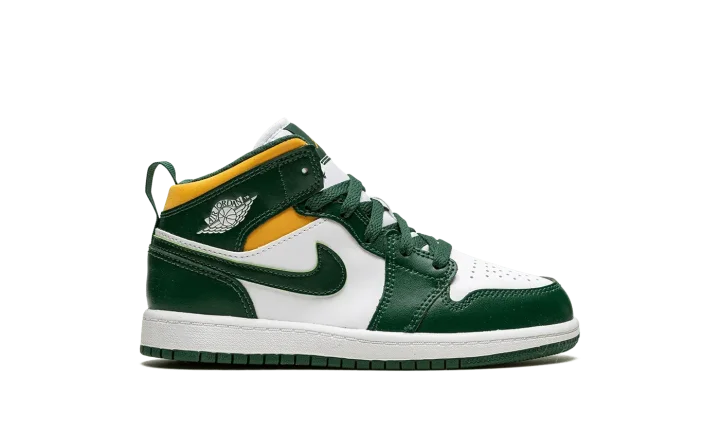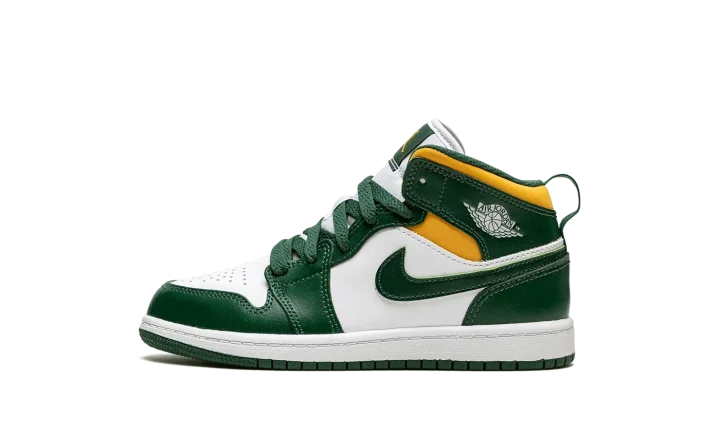 The Air Jordan 1 Mid PS "Sonics" is the preschool sizing of Michael Jordan's first signature shoe in the popular mid-top silhouette in a colorway that nods to the defunct NBA basketball team. The "Sonics" edition of the retro basketball shoe is an unofficial tribute to the Seattle Supersonics, the basketball team that relocated to Oklahoma City and became the Thunder in the late 2000s. As imagined, the colorway features the Sonics' former green, yellow, and white team uniform colors on its design. The toe and mid-panel are constructed in white leather. The overlay panels and Swoosh branding appear in a Noble Green hue. Pollen, or yellow, can be found on the collar beneath the green leather overlay with a white "Wings" logo on it.