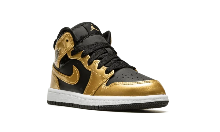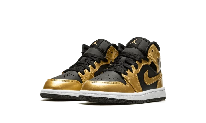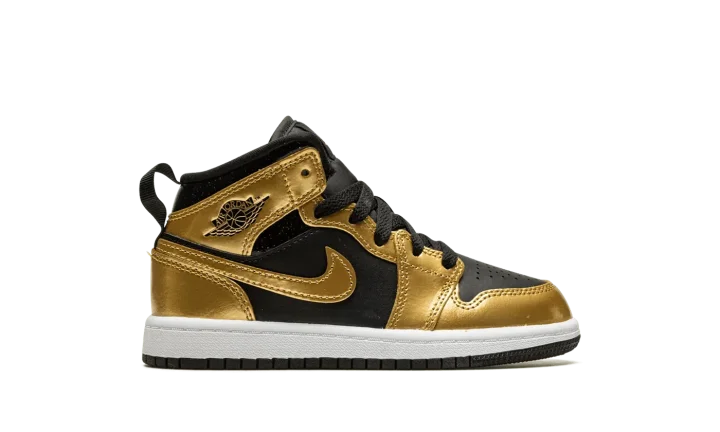 The Air Jordan 1 Mid PS "Metallic Gold" is the preschool sizing of the popular lifestyle shoe in a can't-miss colorway with gold accenting. The "Metallic Gold" Jordan 1 Mid features a black leather base with Metallic Gold leather overlays on the toe, forefoot, collar, heel, and on the leather Swoosh found on both sides. A black "Wings" logo appears on the collar overlay while a gold Jumpman is found on the black nylon tongue tag on the black nylon tongue. The white rubber midsole and black rubber outsole complete the look. Release date: October 6, 2022